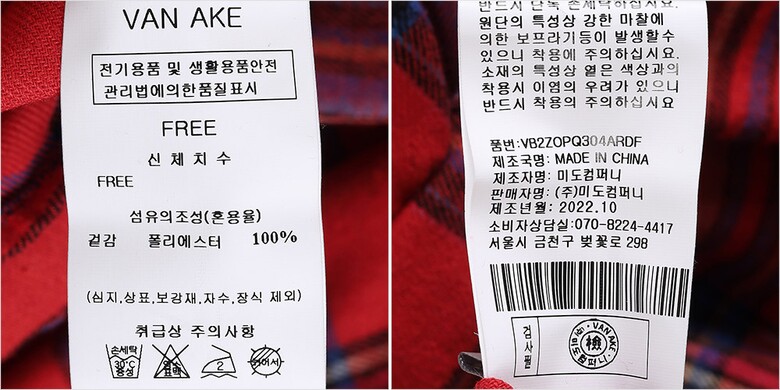 | 1. 제품 소재 (섬유의 조성 또는 혼용률을 백분율로 표시, 기능성인 경우 성적서 또는 허가서) | 겉감-폴리에스터100% |