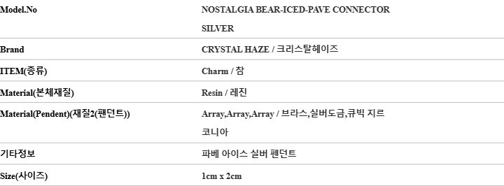 크리스탈헤이즈 NOSTALGIA BEAR-ICED-PAVE CONNECTOR SILVER 노스텔지아 베어 파베 아이스 실버 펜던트 참