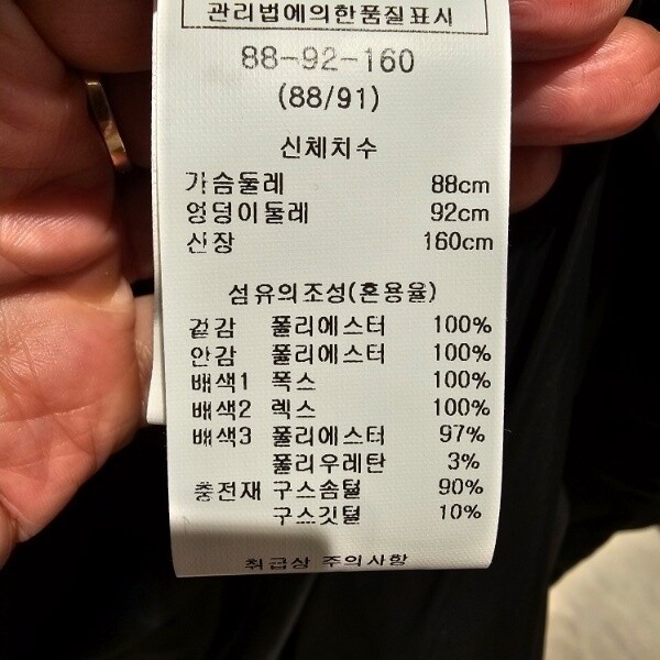 제품소재 : 충전재 구스 솜털 90% 구스 깃털 10% / 모자퍼 폭스퍼 100% / 카라퍼 렉스퍼 100% / 소매배색 폴리에스터 97% 폴리우레탄 3%