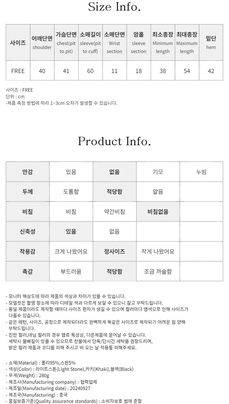 | 1. 제품 소재 (섬유의 조성 또는 혼용률을 백분율로 표시, 기능성인 경우 성적서 또는 허가서) | 상세이미지 참조 |