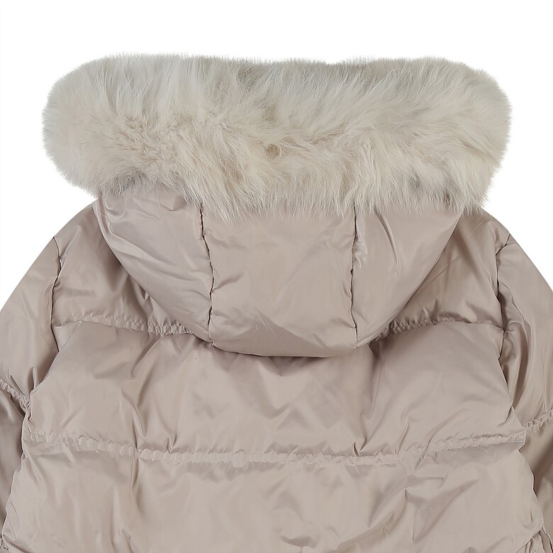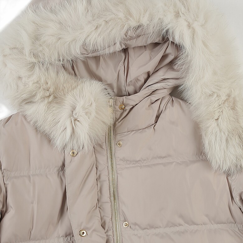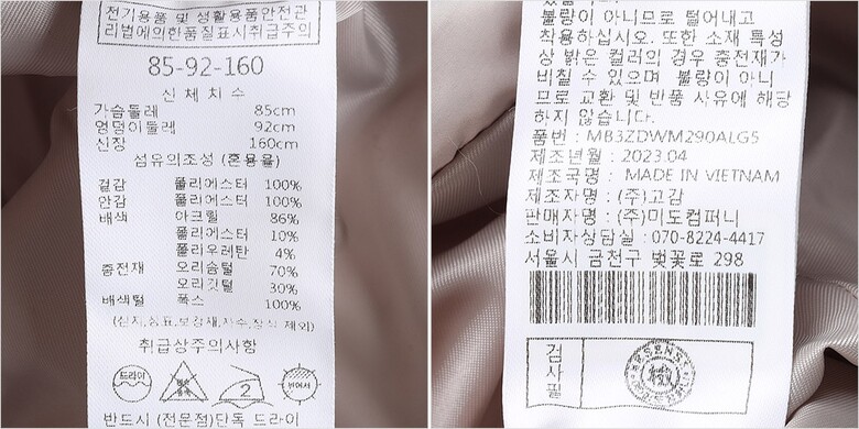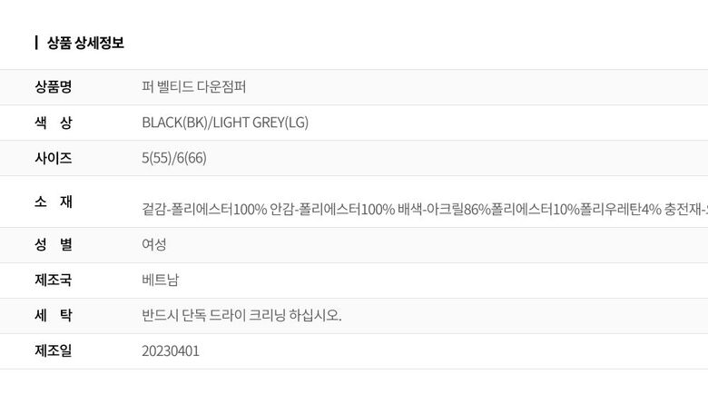 | 1. 제품 소재 (섬유의 조성 또는 혼용률을 백분율로 표시, 기능성인 경우 성적서 또는 허가서) | 겉감-폴리에스터100% 안감-폴리에스터100% 배색-아크릴86%폴리에스터10%폴리우레탄4% 충전재-오리솜털70% 오리깃털30% 배색털-폭스100% |