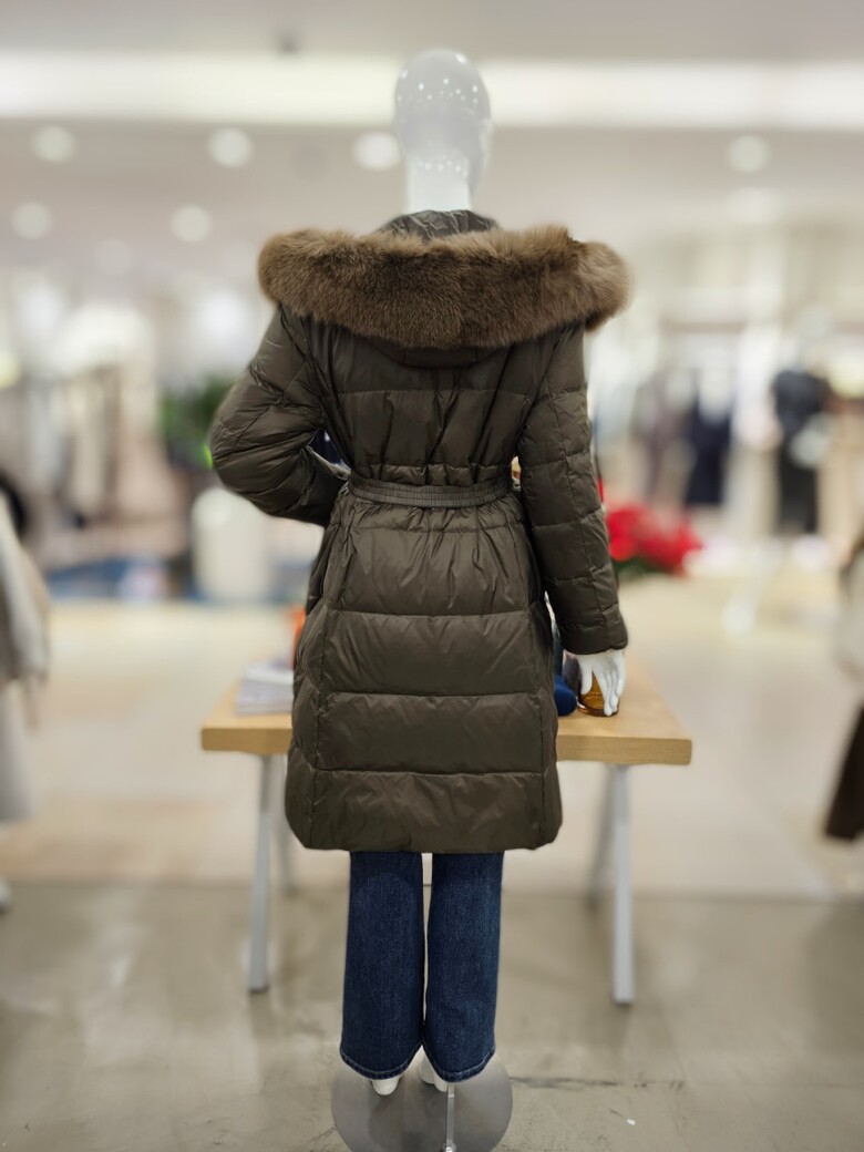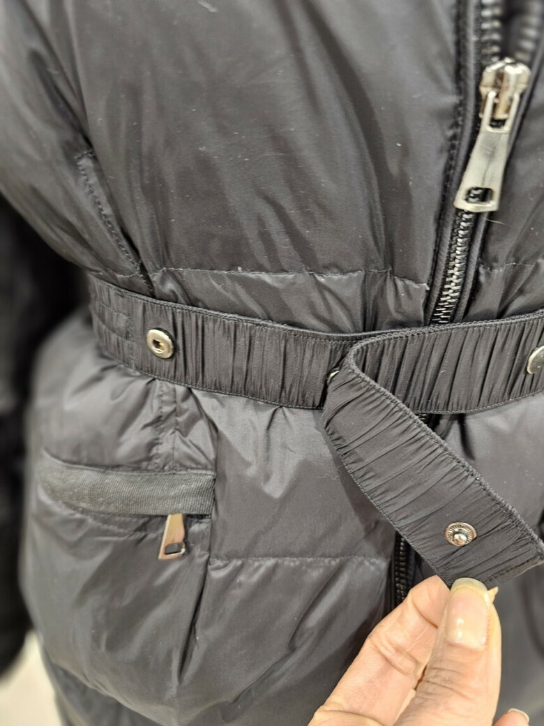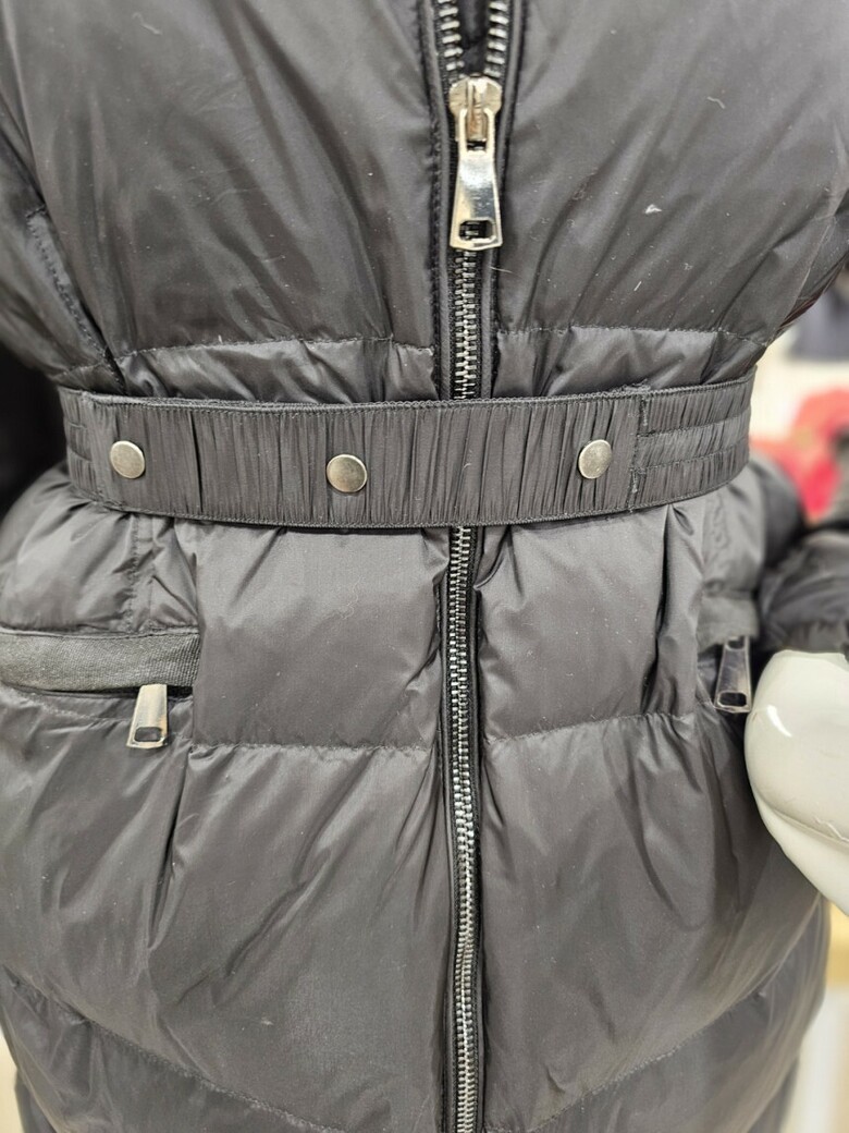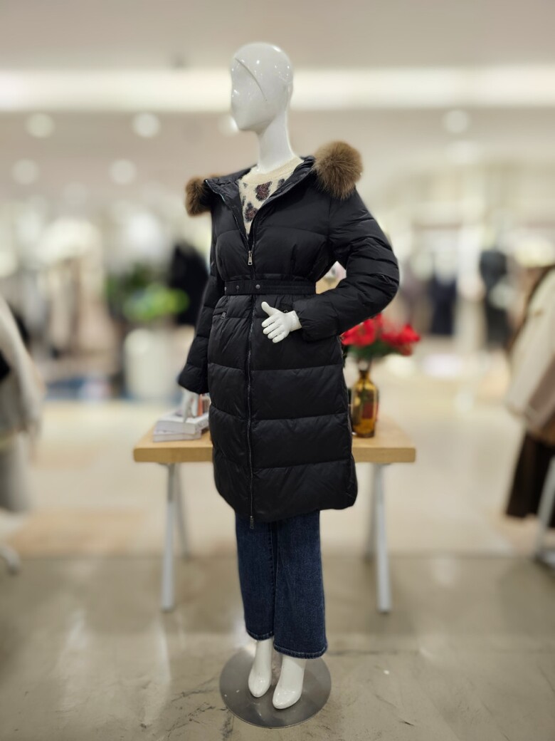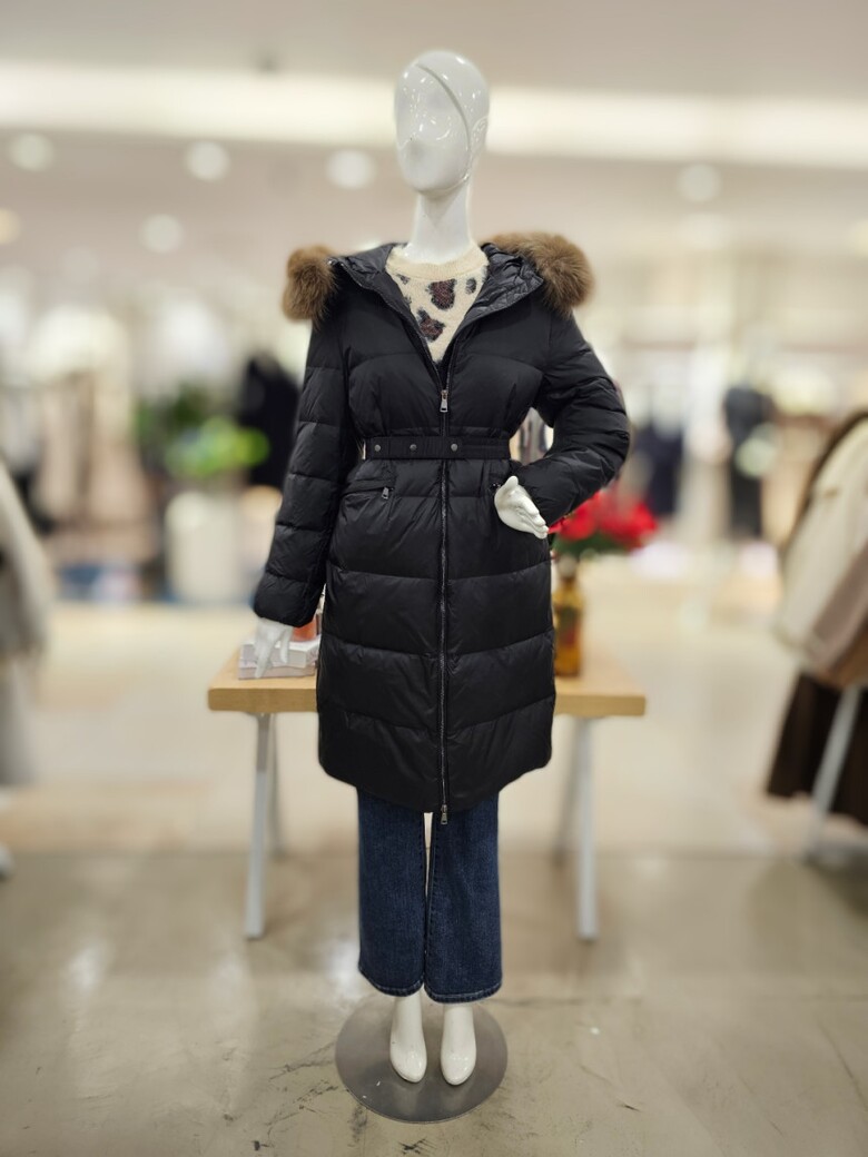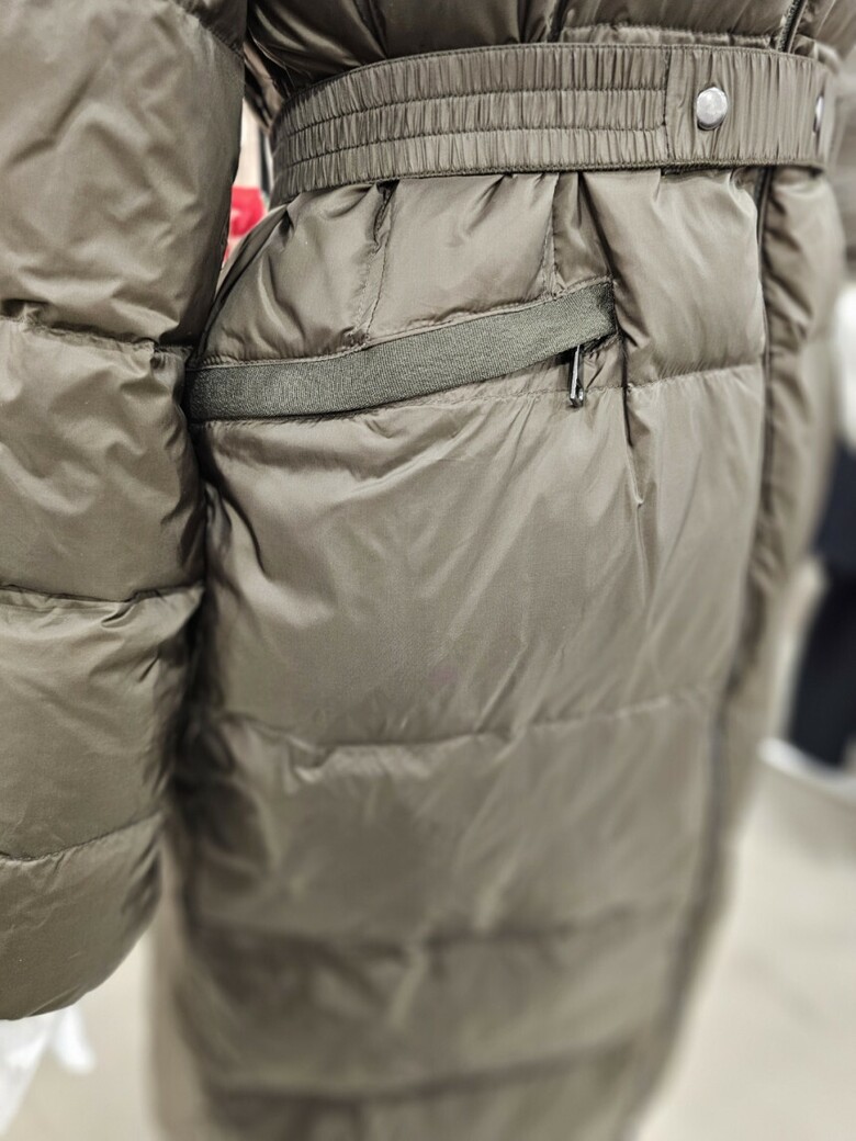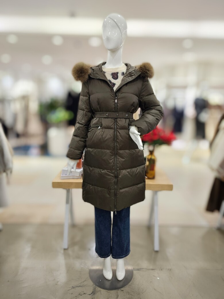 가벼운 느낌으로 착용하기 좋은 오리털 롱 패딩점퍼입니다. 허리 벨트 구성으로 라인감