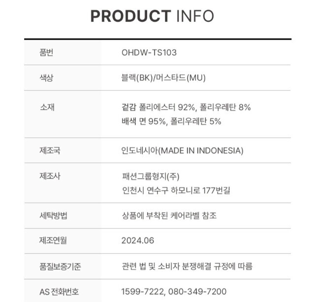 | 6. 세탁방법 및 취급시 주의사항 | 상품상세참조 |
