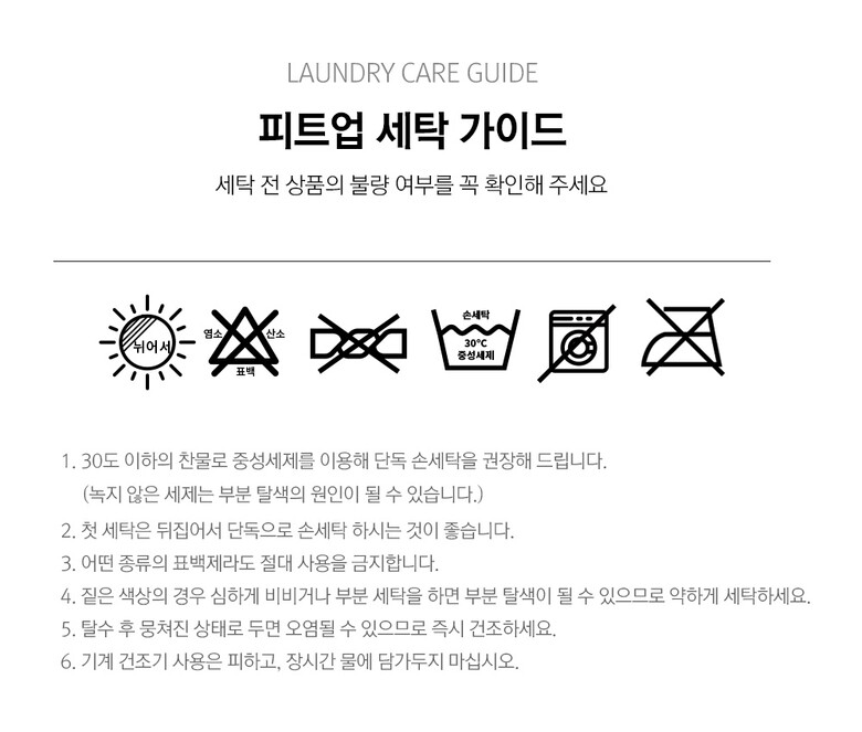 6. 세탁방법 및 취급시 주의사항 | 첫 단독 손세탁 권장, 단독세탁, 손세탁, 중성세제, 찬물세탁 |