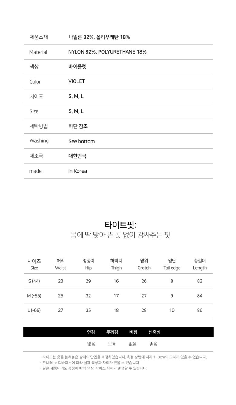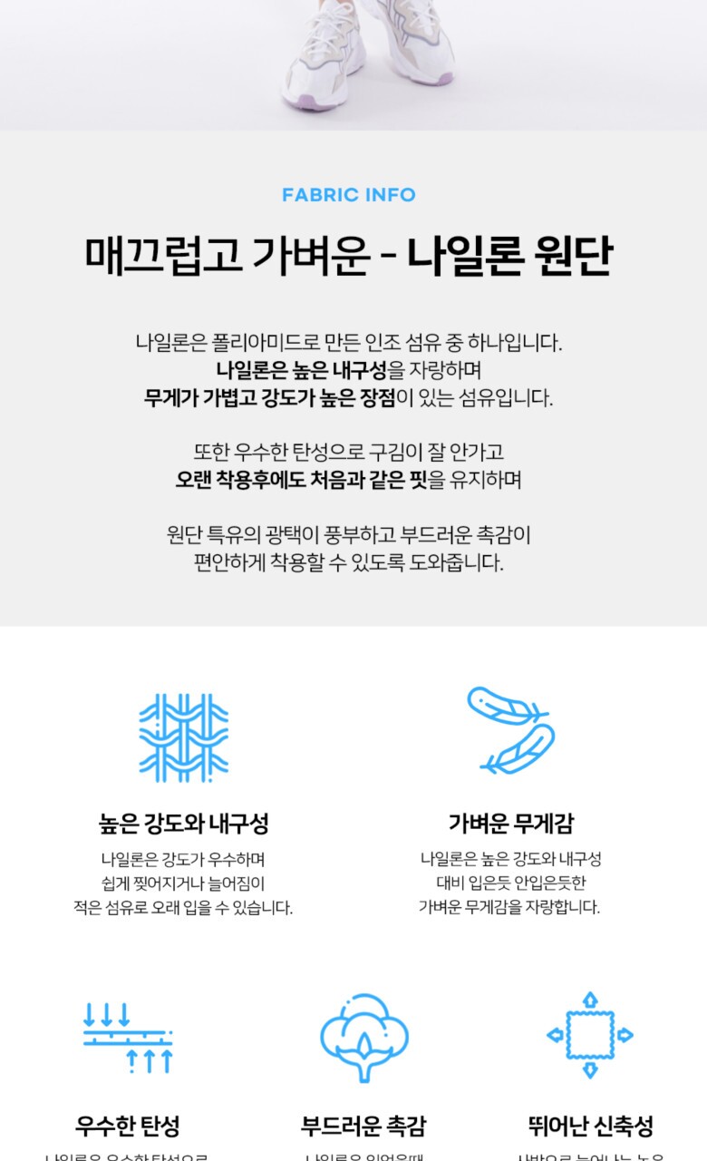 1. 제품 소재 (섬유의 조성 또는 혼용률을 백분율로 표시, 기능성인 경우 성적서 또는 허가서) | 나일론 82% 폴리우레탄18% |