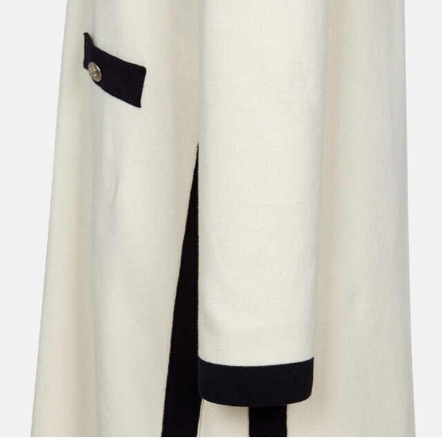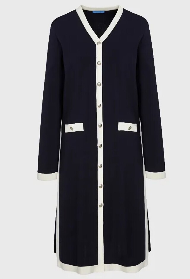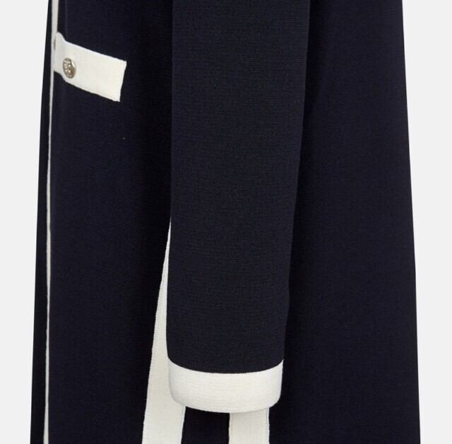 보색 트리밍이 화사하고 깔끔한 니트 원피스입니다.군더더기없는 깔끔한 라인으로 체형커버에도 좋아요