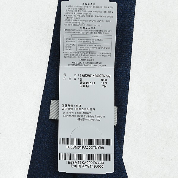 | 6. 취급시 주의사항 | -넥타이 보관시 매듭을 풀고 보관해 주십시요.-구김이 가지 않도록 길게 걸어두시는것이 좋습니다.-니트 타이의 경우, 장기간 걸어두시면 늘어날 수 있습니다. -둥글게 말아서 보관해 주십시요. - 접어서 보관하실 경우, 모양이 망가질 수 있으니 피해 주십시요.-물세탁시 제품의 광택 및 색상이 감소될 우려가 있습니다. -세탁시 사용시 모양이 망가질 수 있습니다. |