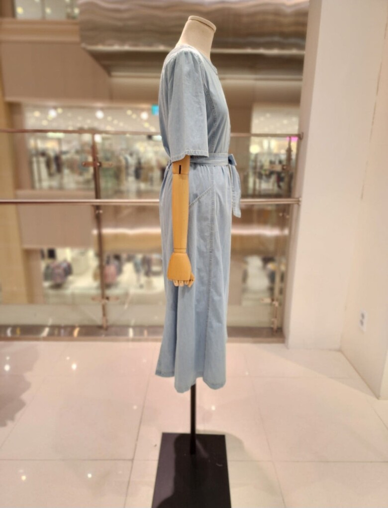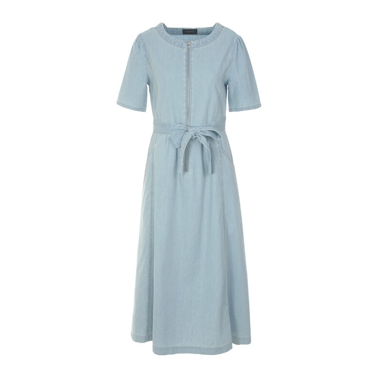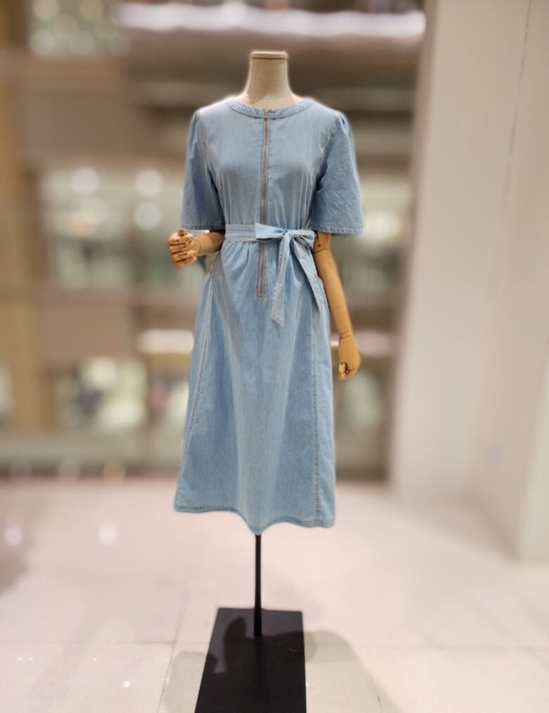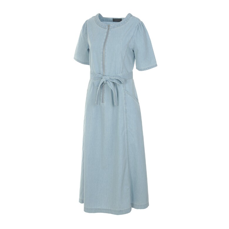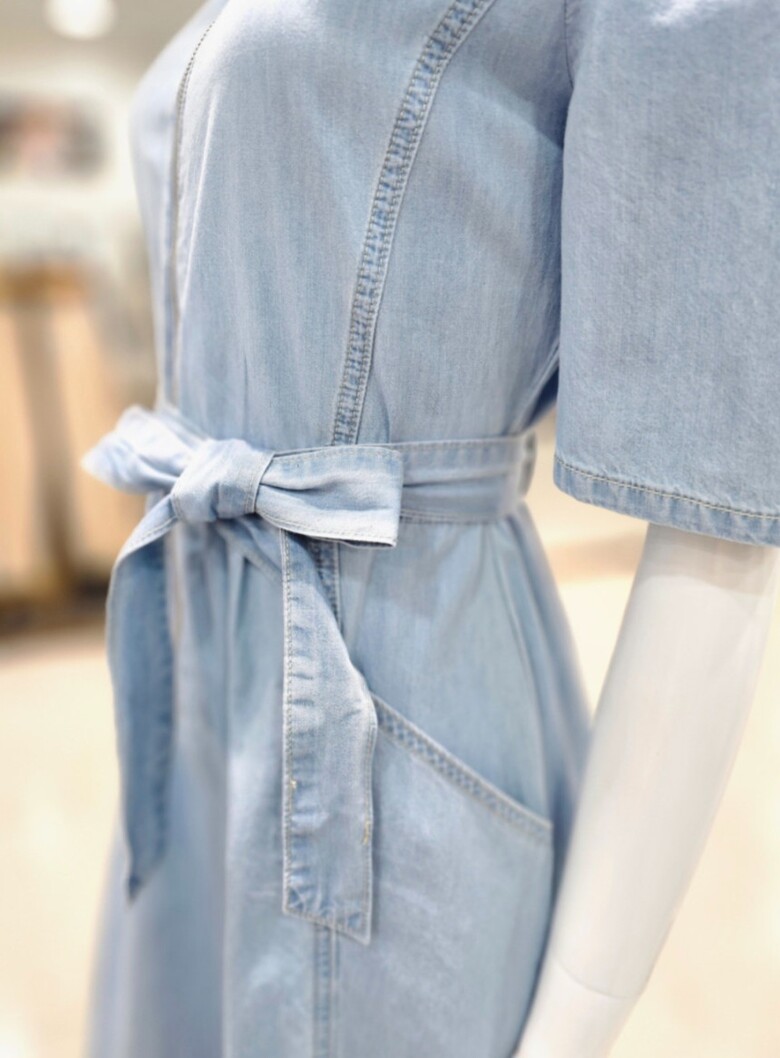 라운드 집업넥에 롱기장 허리벨트가있는 여름소재 데님 원피스입니다.