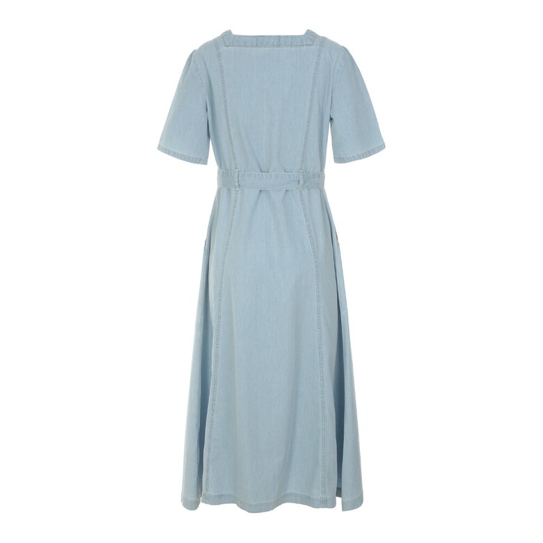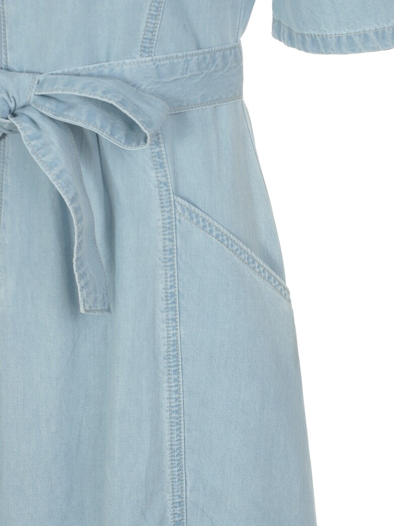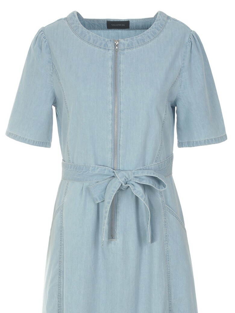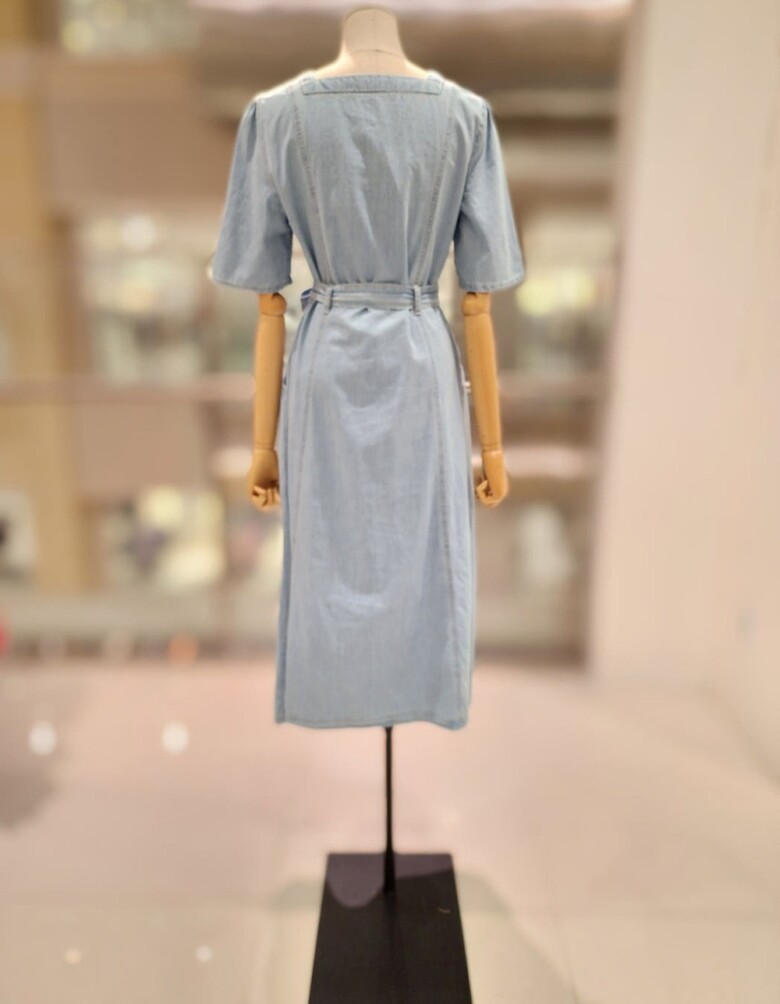 라운드 집업넥에 롱기장 허리벨트가있는 여름소재 데님 원피스입니다.