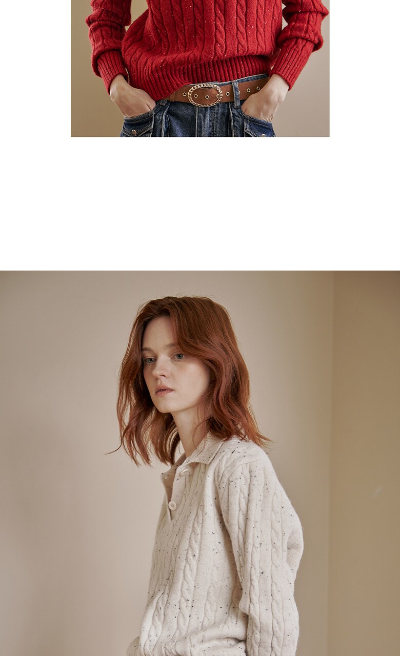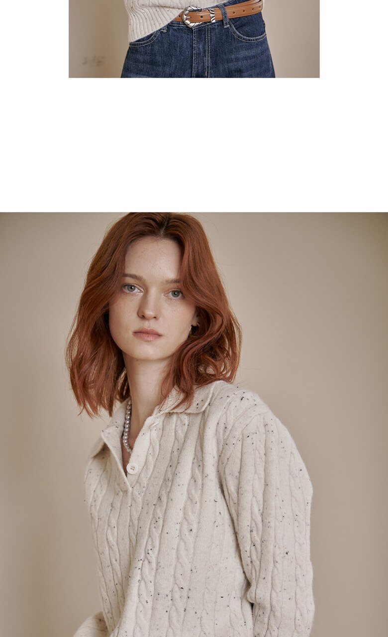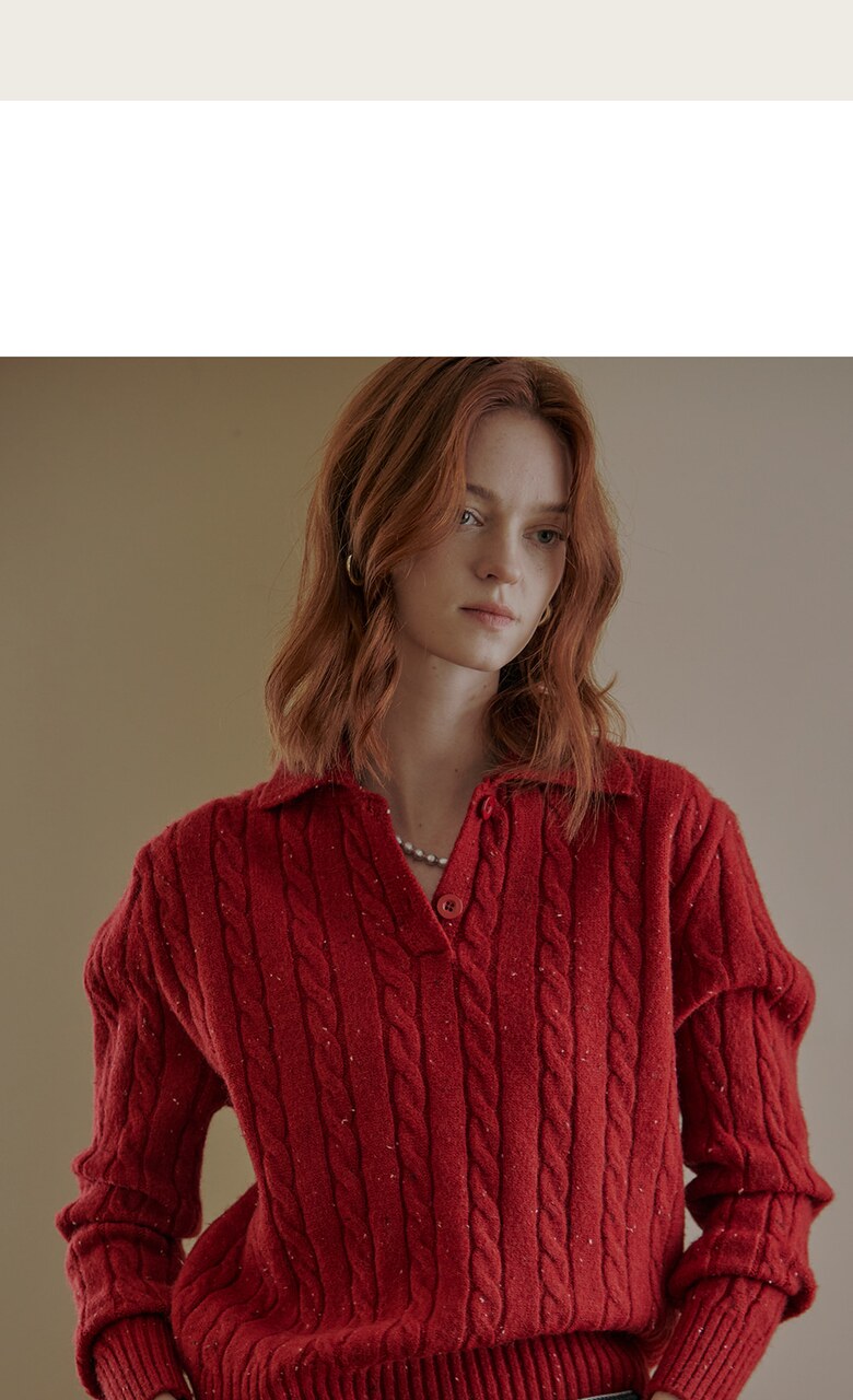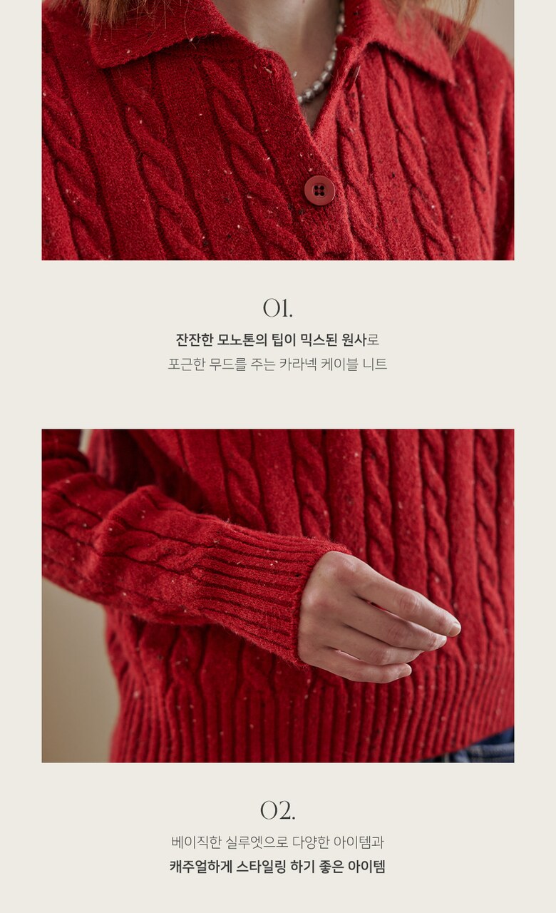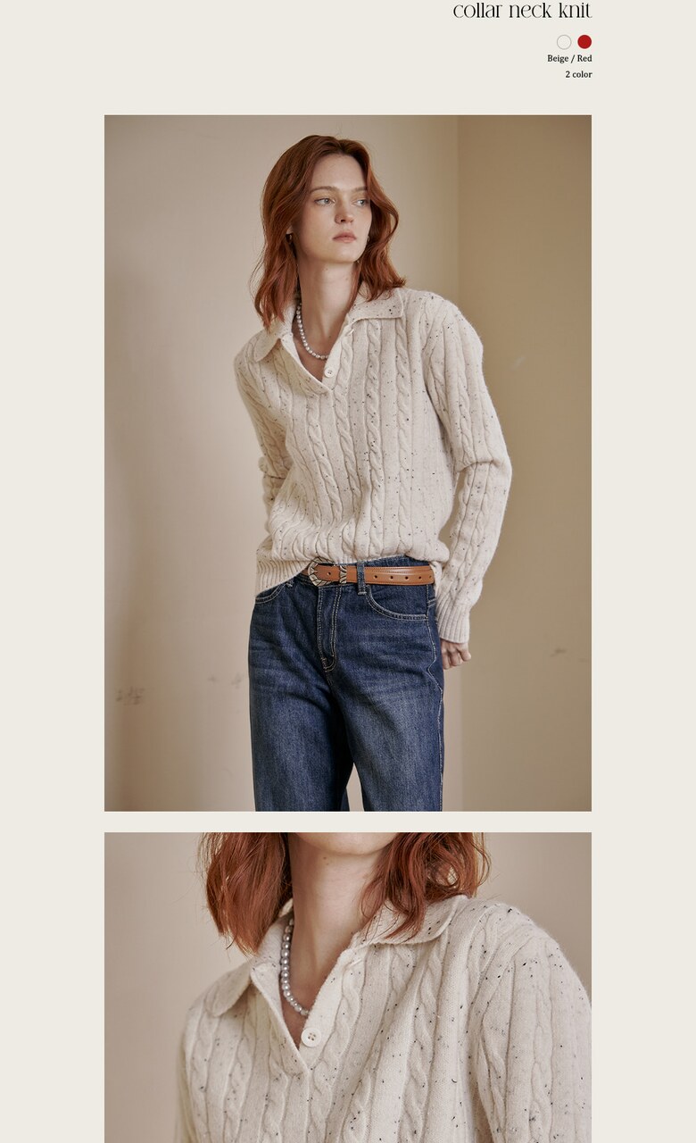 포근한 무드가 느껴지는 카라넥 케이블 니트입니다.