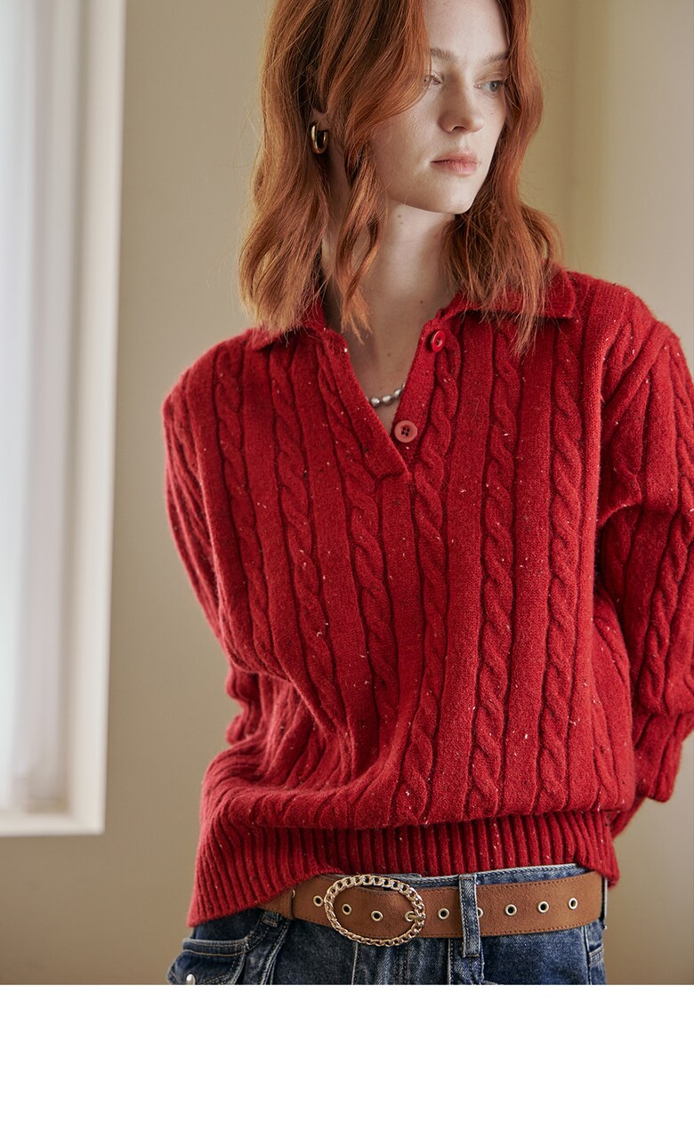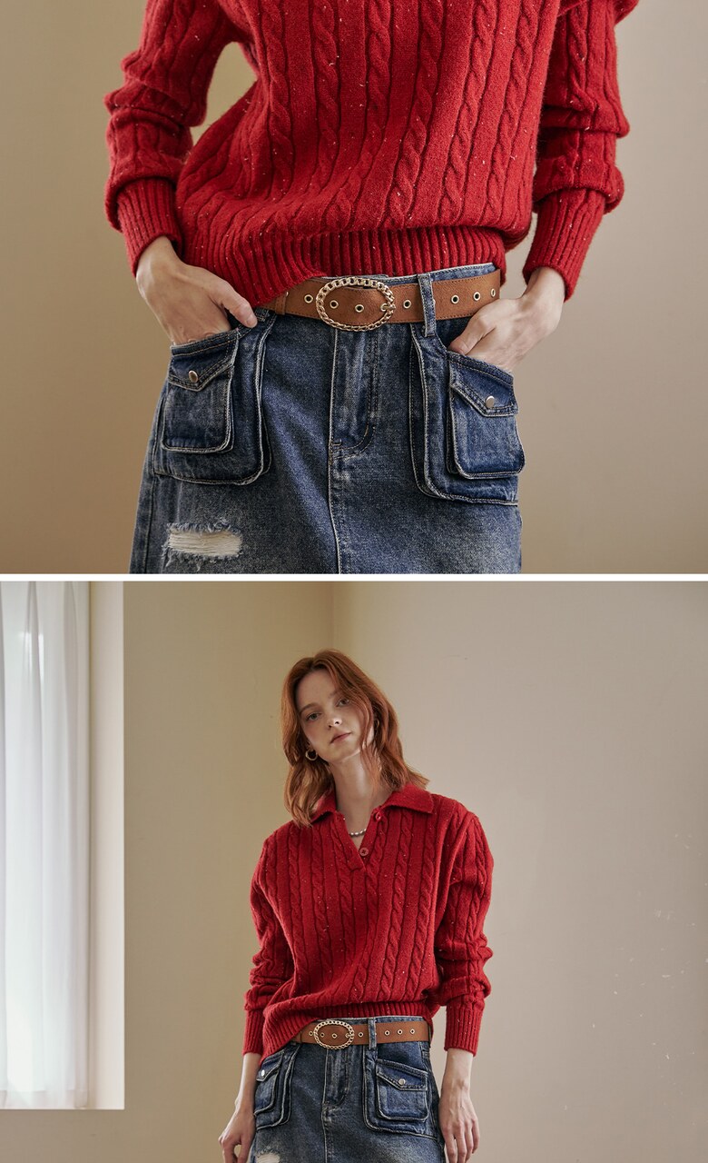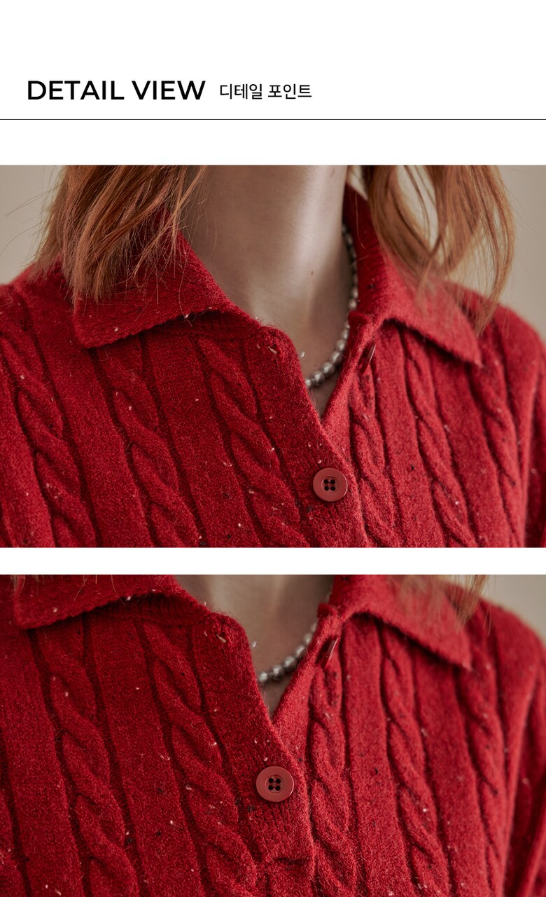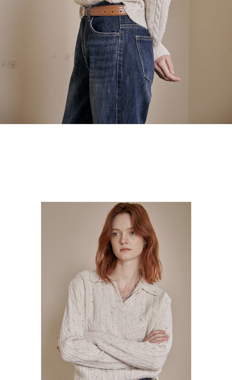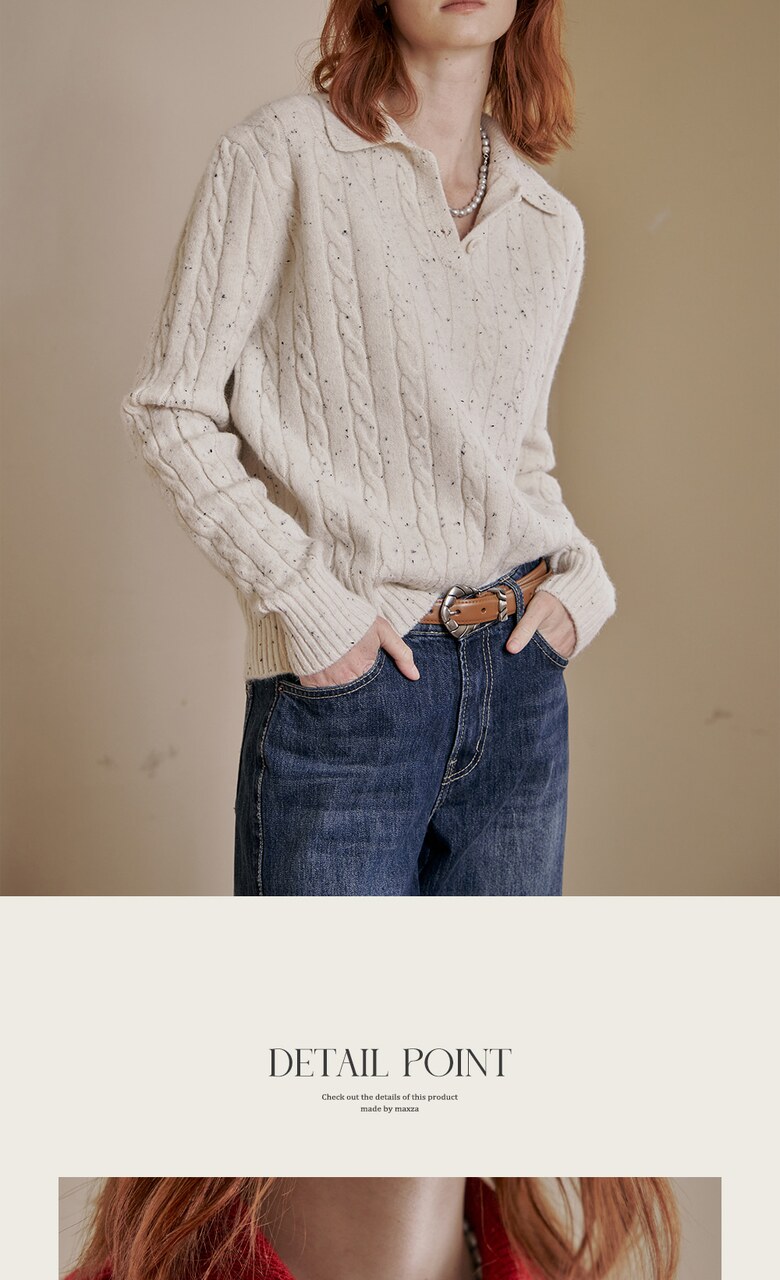 포근한 무드가 느껴지는 카라넥 케이블 니트입니다.