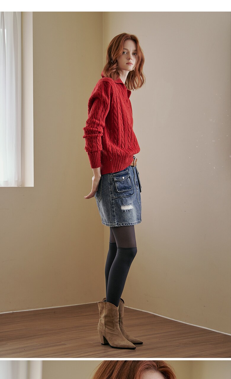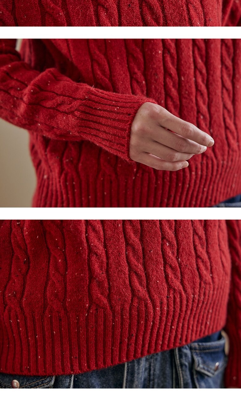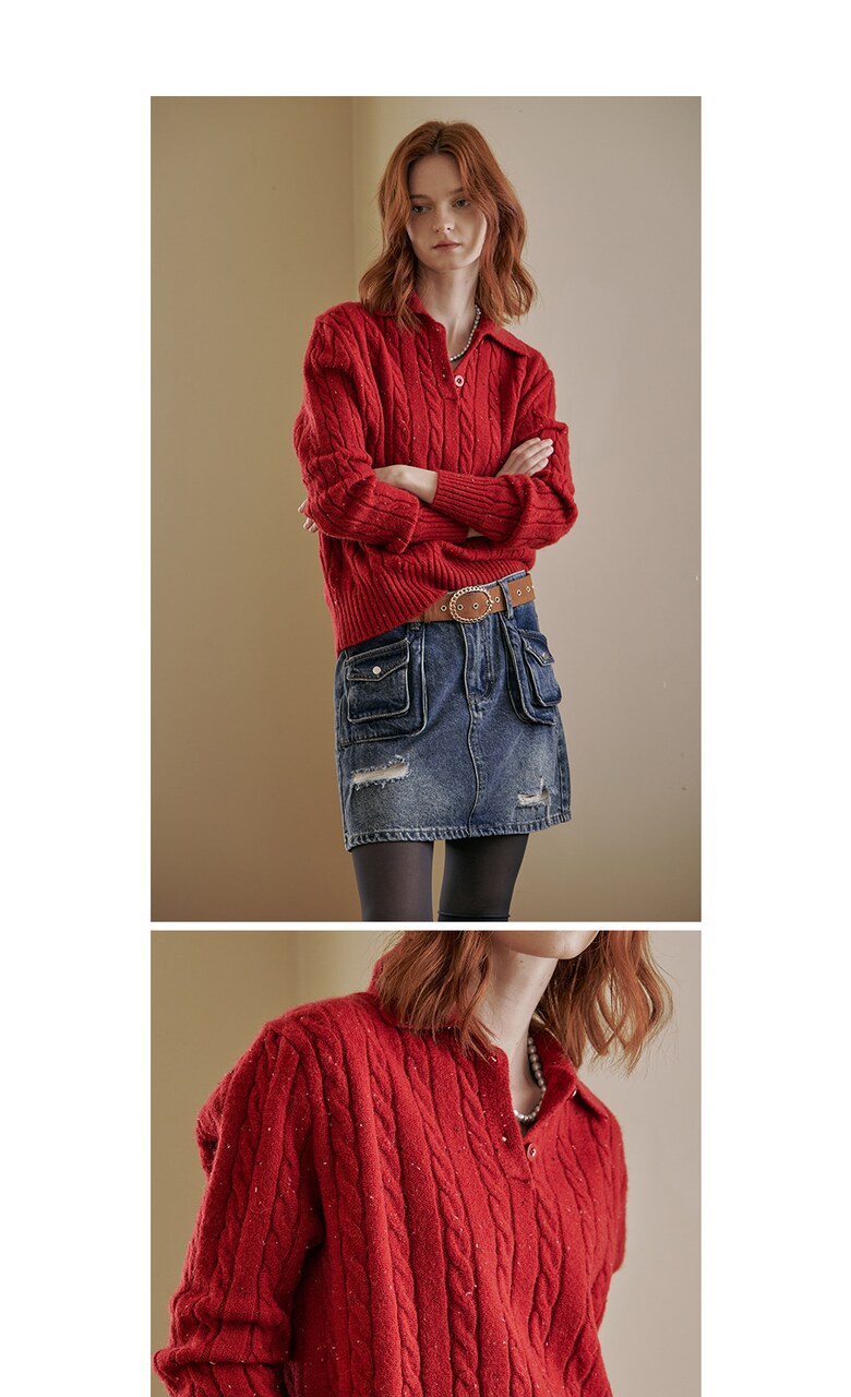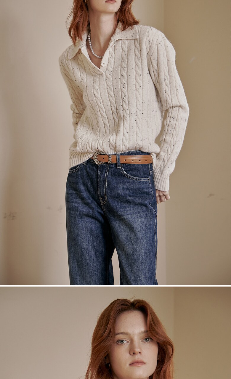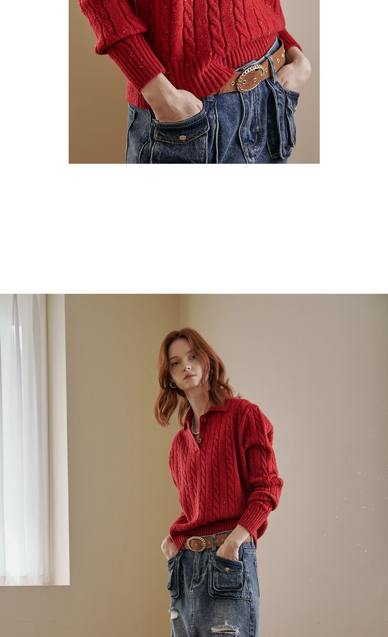 포근한 무드가 느껴지는 카라넥 케이블 니트입니다.