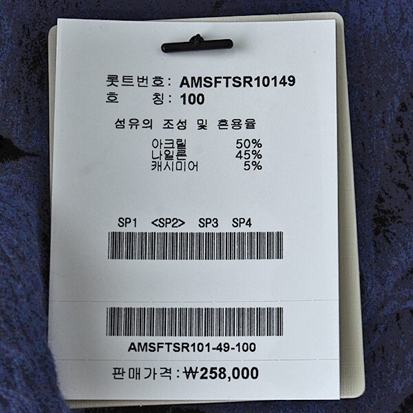 | 1. 제품 소재 (섬유의 조성 또는 혼용률을 백분율로 표시, 기능성인 경우 성적서 또는 허가서) | 아크릴50%나일론45%캐시미어5% |