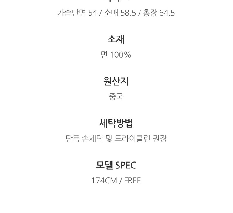 | 1. 제품 소재 (섬유의 조성 또는 혼용률을 백분율로 표시, 기능성인 경우 성적서 또는 허가서) | 상세페이지 참조 |