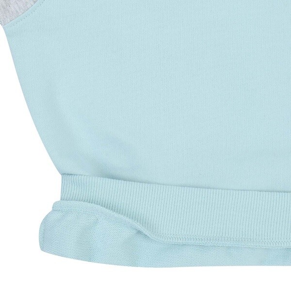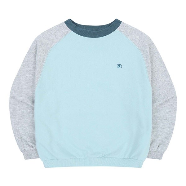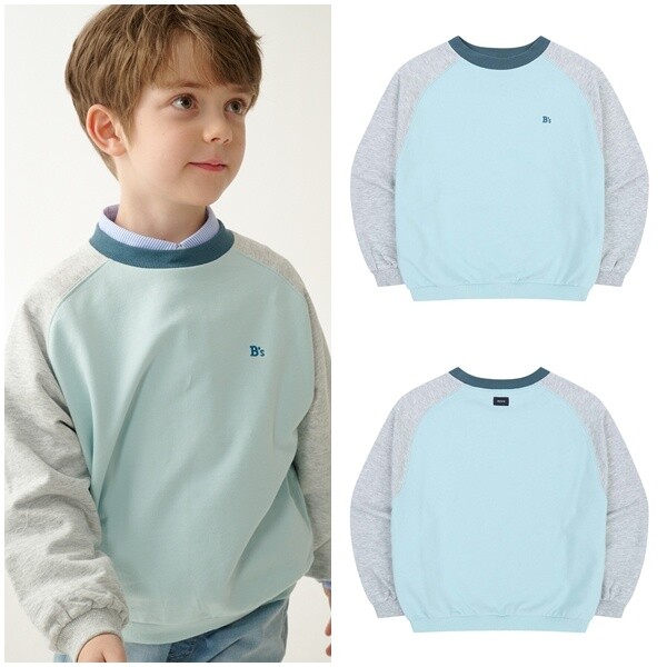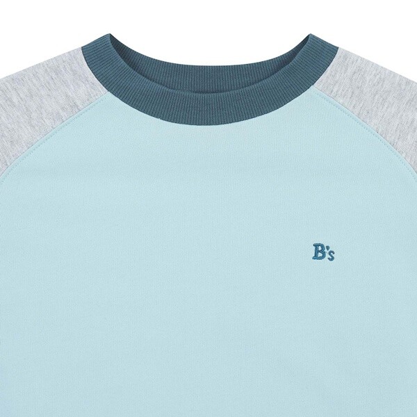 산뜻한 스카이 블루 컬러의 라글란 배색 맨투맨 티셔츠 아이템입니다. 스카이 블루 컬러와 그레이 컬러의 조화가 세련된 맨투맨 티셔츠 아이템입니다. 선명하게 들어간 네이비 컬러의 네크라인 배색과 B's 자수가 더욱 세련된 포인트를 더해주는 아이템입니다.