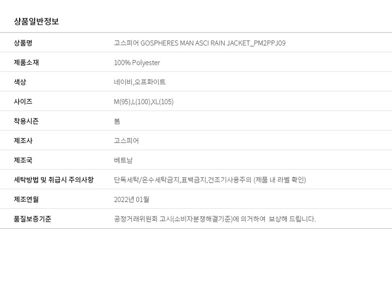 | 6. 세탁방법 및 취급시 주의사항 | 단독세탁/온수세탁금지,표백금지,건조기사용주의 (제품 내 라벨 확인) |
