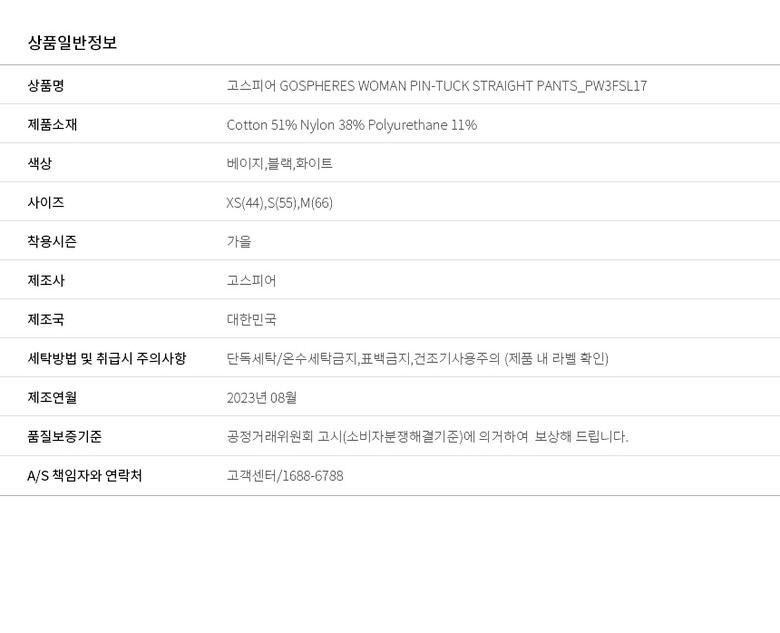 1. 제품 소재 (섬유의 조성 또는 혼용률을 백분율로 표시, 기능성인 경우 성적서 또는 허가서) Cotton 51% Nylon 38% Polyurethane 11%