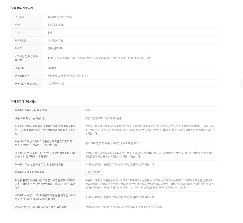 1. 제품 소재 (섬유의 조성 또는 혼용률을 백분율로 표시, 기능성인 경우 성적서 또는 허가서) | 상품상세참조 |