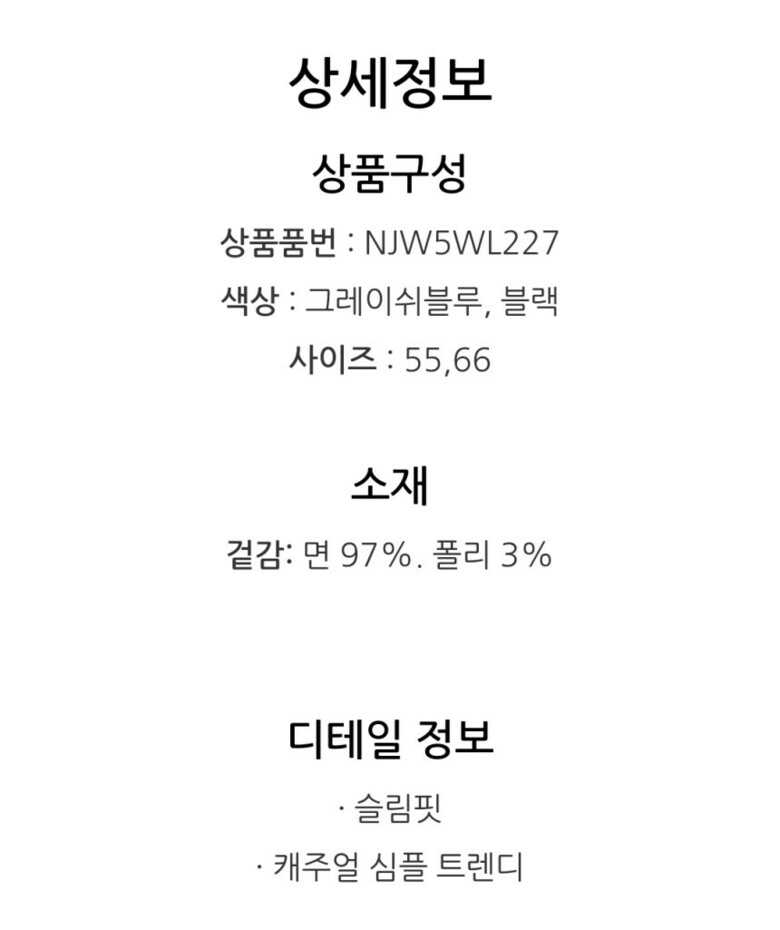 | 1. 제품 소재 (섬유의 조성 또는 혼용률을 백분율로 표시, 기능성인 경우 성적서 또는 허가서) | 상품상세참조 |