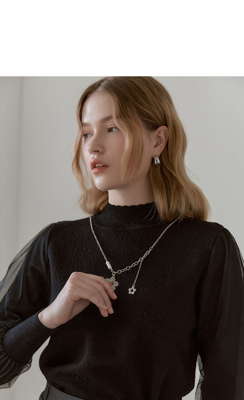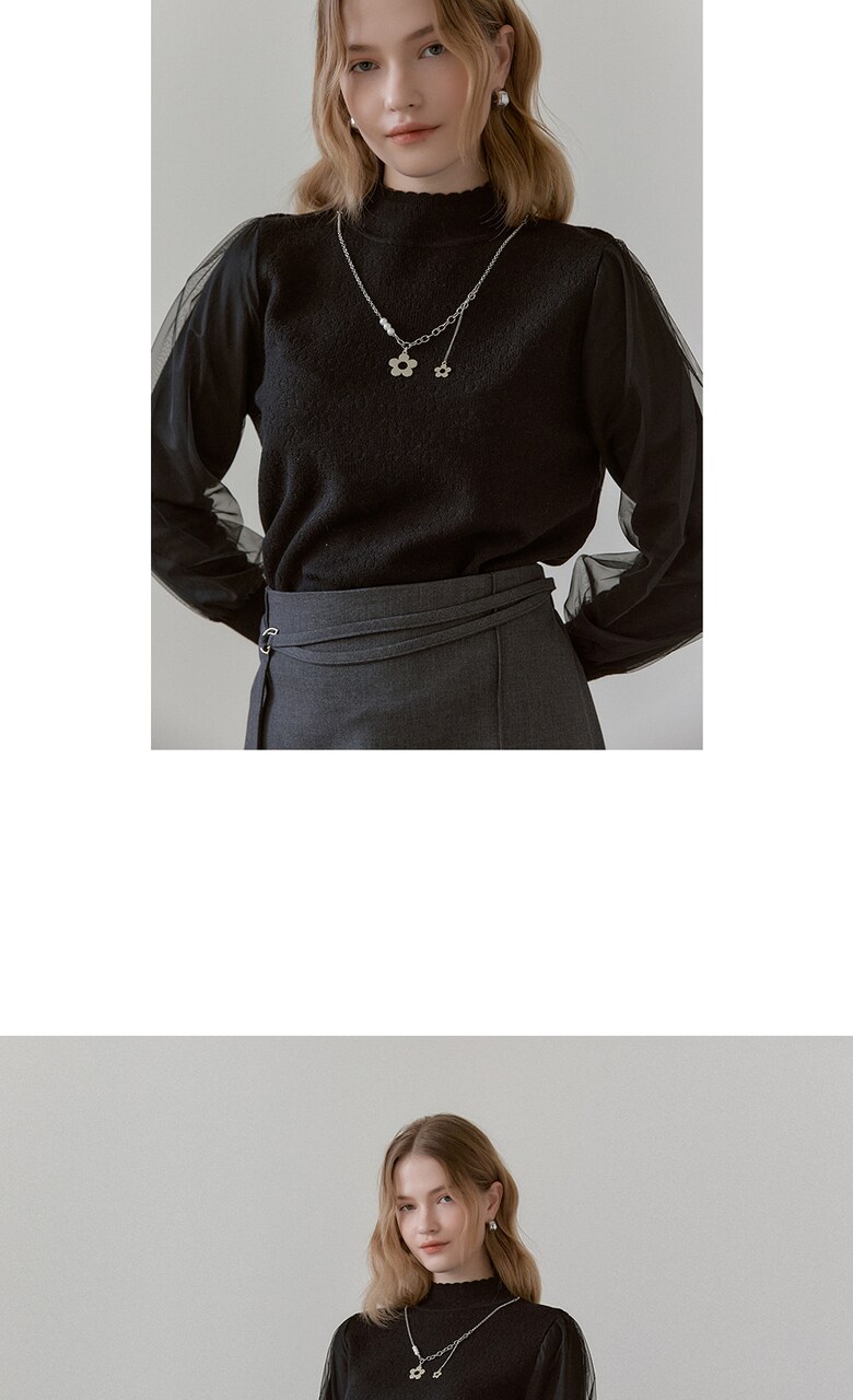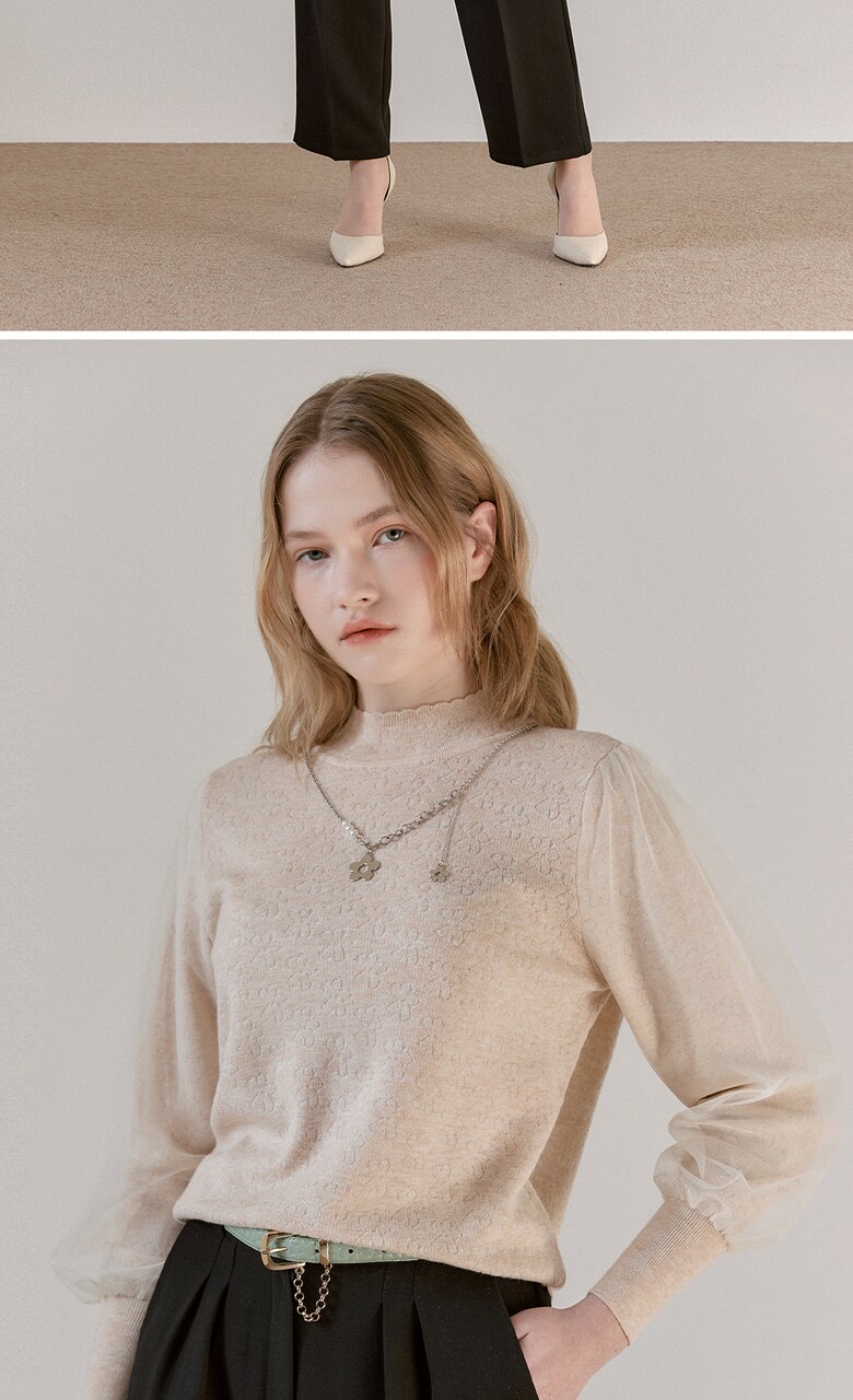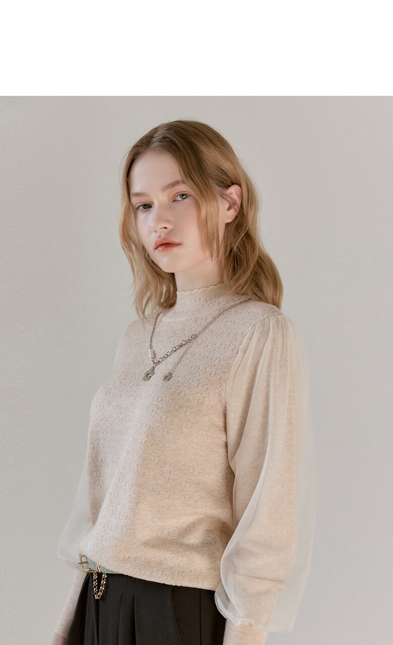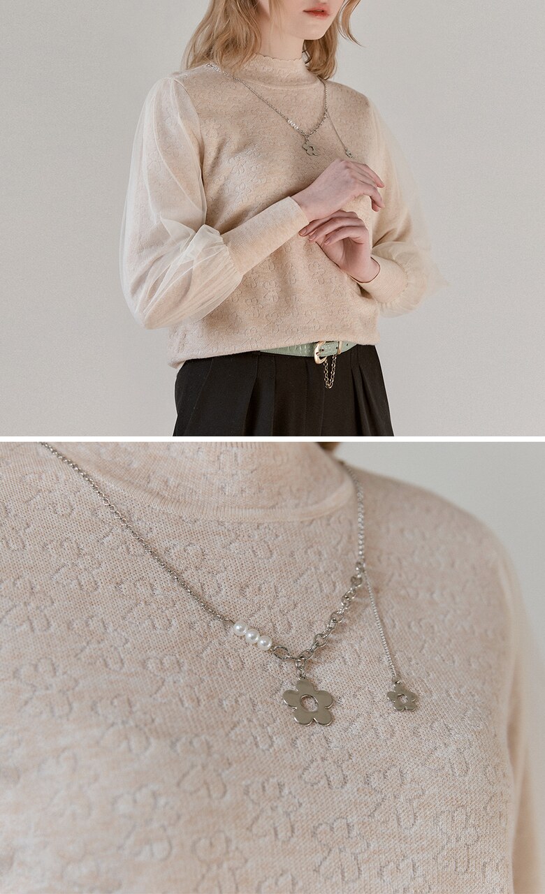 플라워 자카드 체인장식 메쉬소매 반목폴라 니트