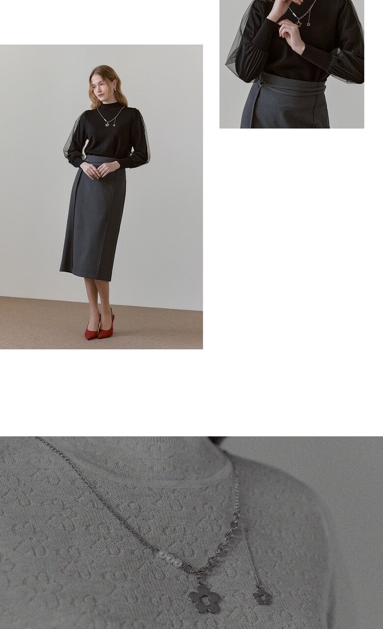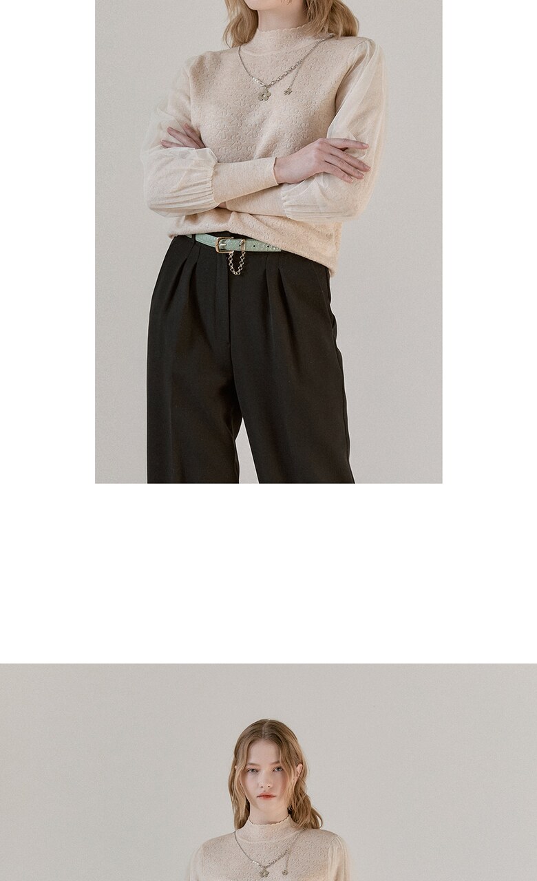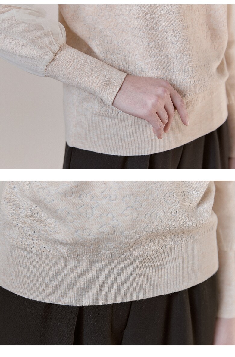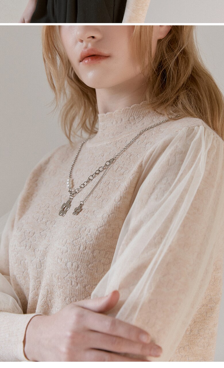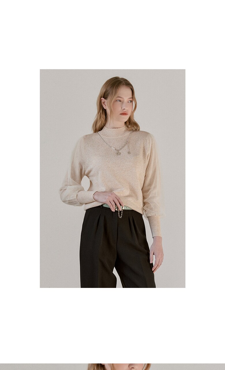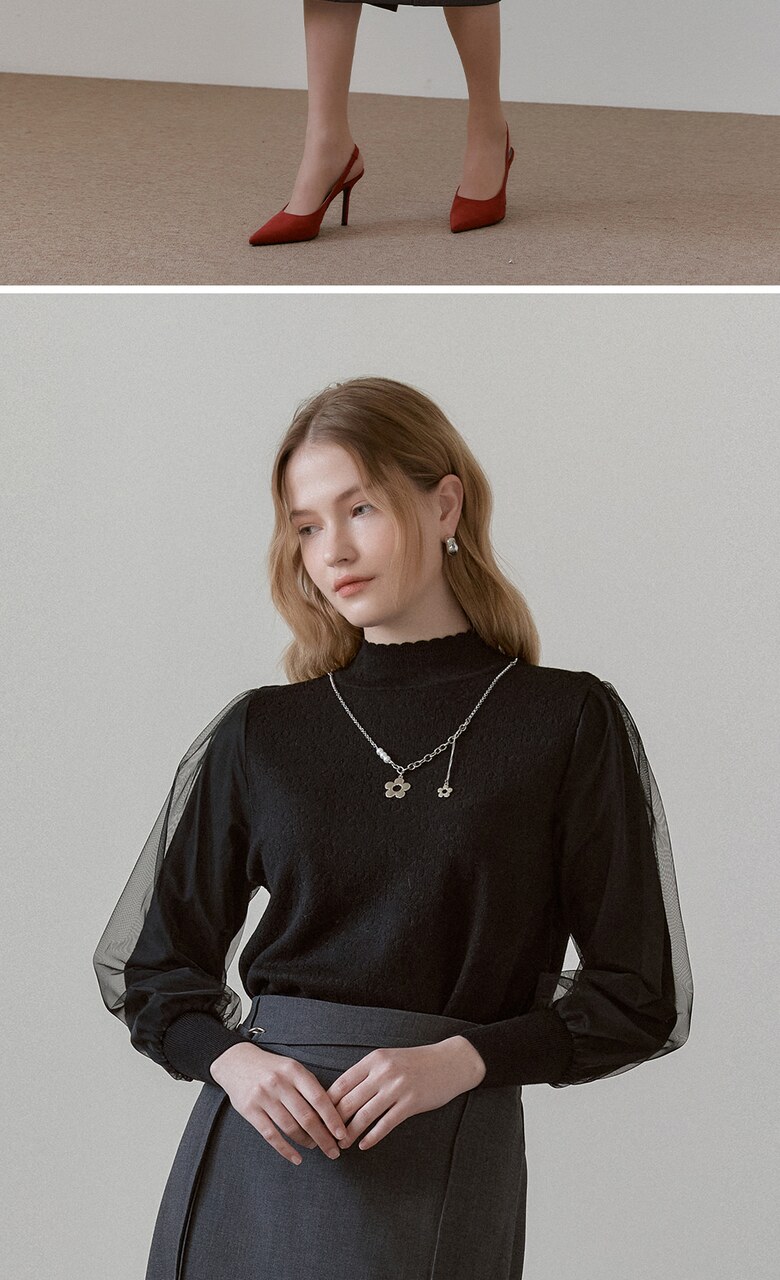 플라워 자카드 체인장식 메쉬소매 반목폴라 니트