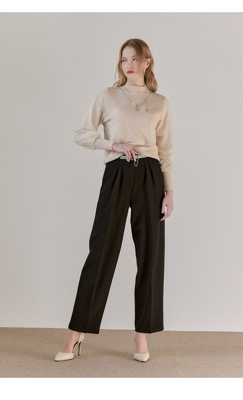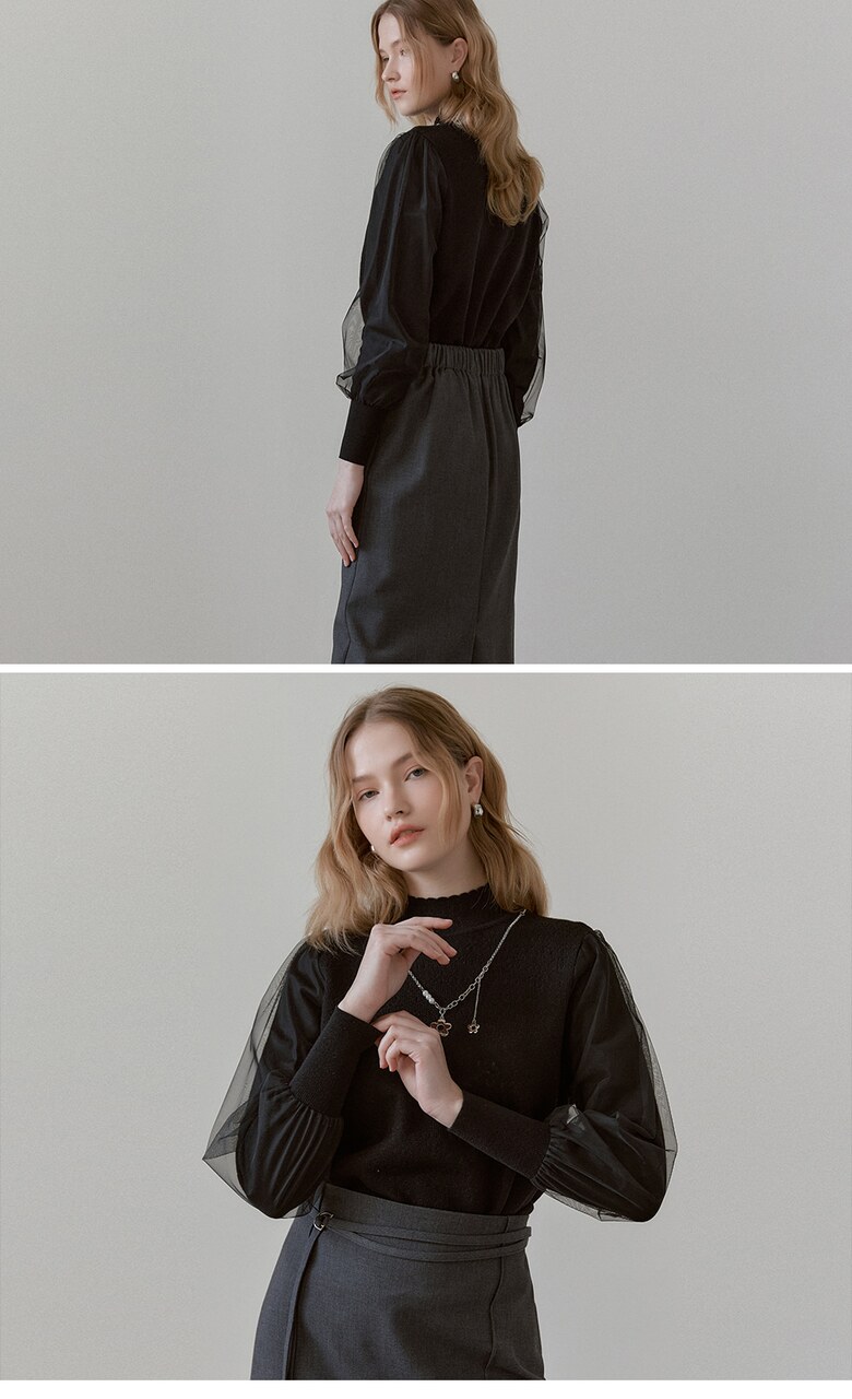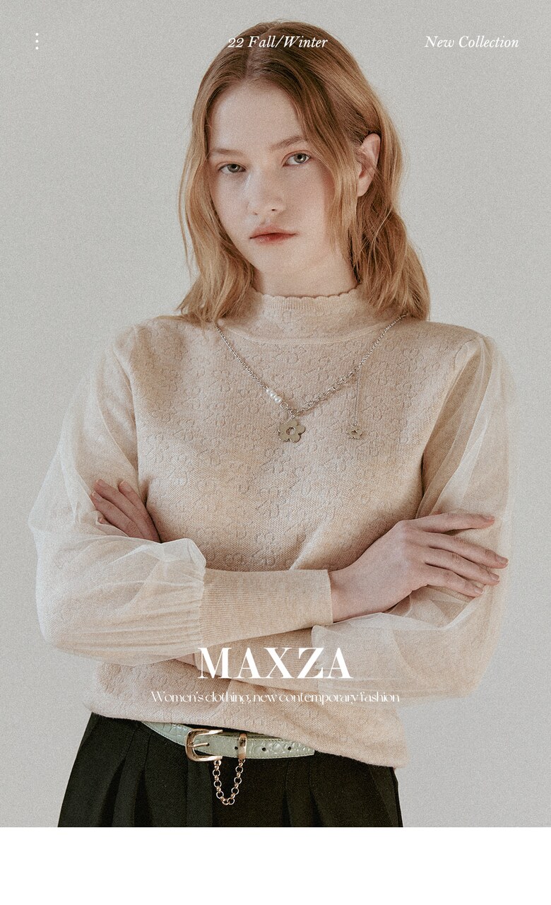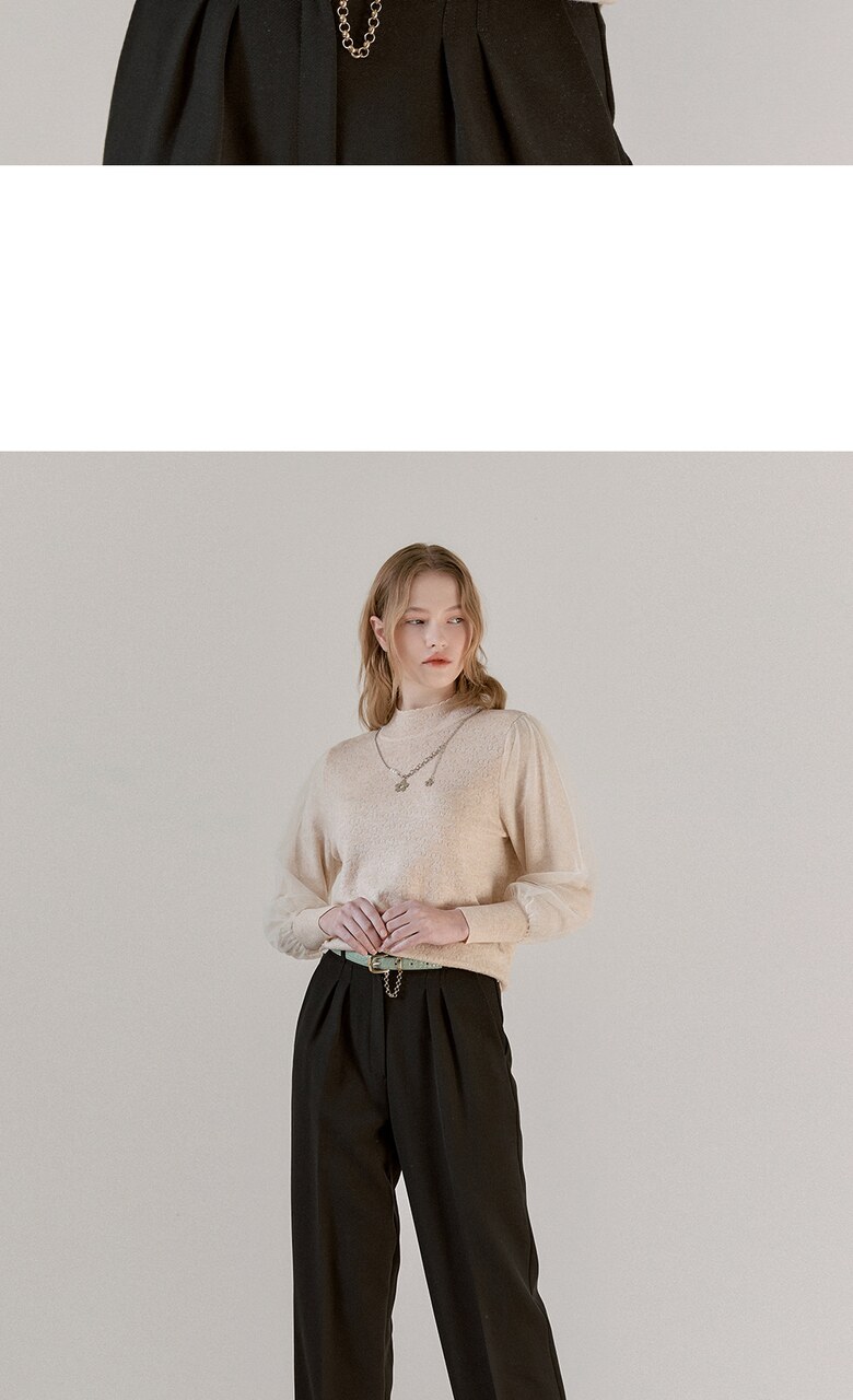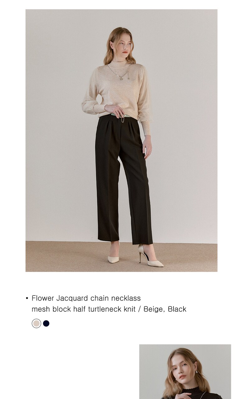 플라워 자카드 체인장식 메쉬소매 반목폴라 니트