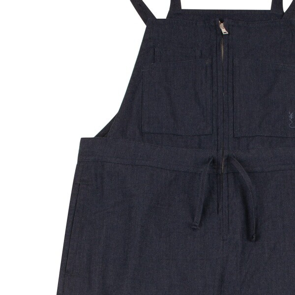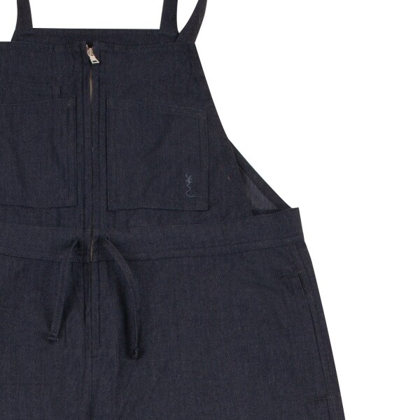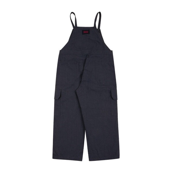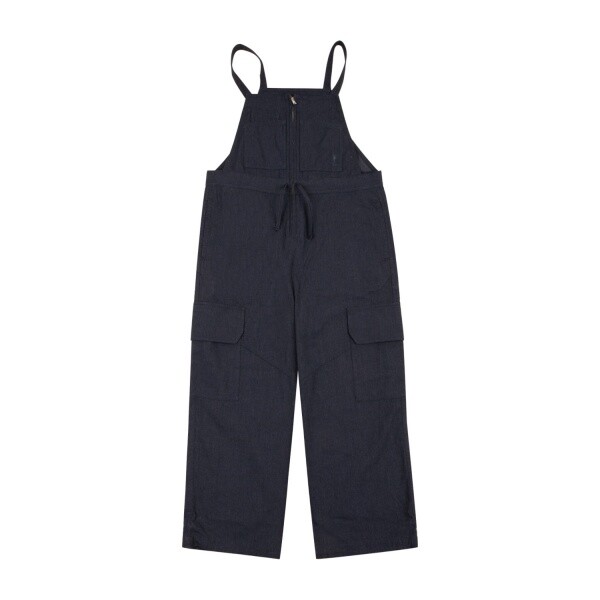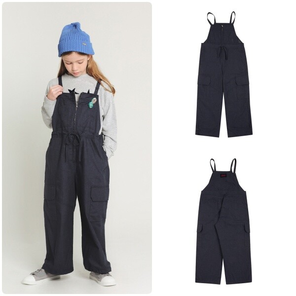 네이비 컬러 우븐 점퍼 팬츠입니다. 여유있는 힙한 실루엣의 팬츠로 제안하였습니다.허리를 조여서 연출이 가능합니다. 어깨끈은 단추로 조절이 가능합니다.