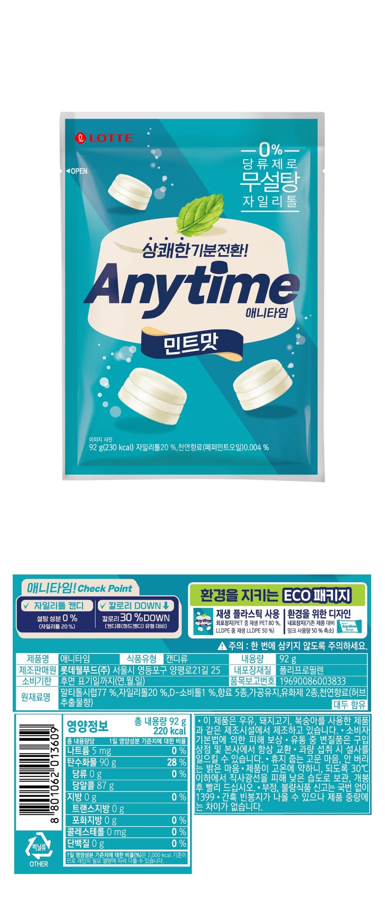 [롯데] 애니타임 무설탕 자일리톨 밀크 민트 92g