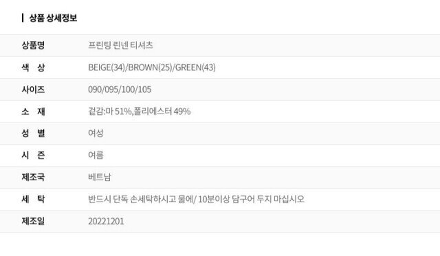 | 1. 제품 소재 (섬유의 조성 또는 혼용률을 백분율로 표시, 기능성인 경우 성적서 또는 허가서) | 상품상세참조 |