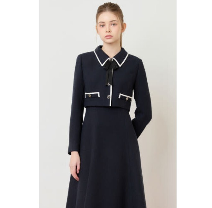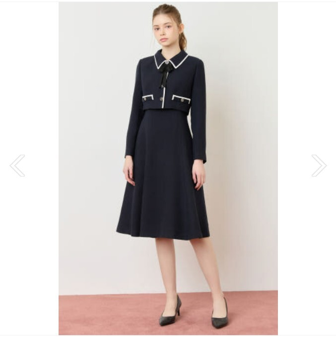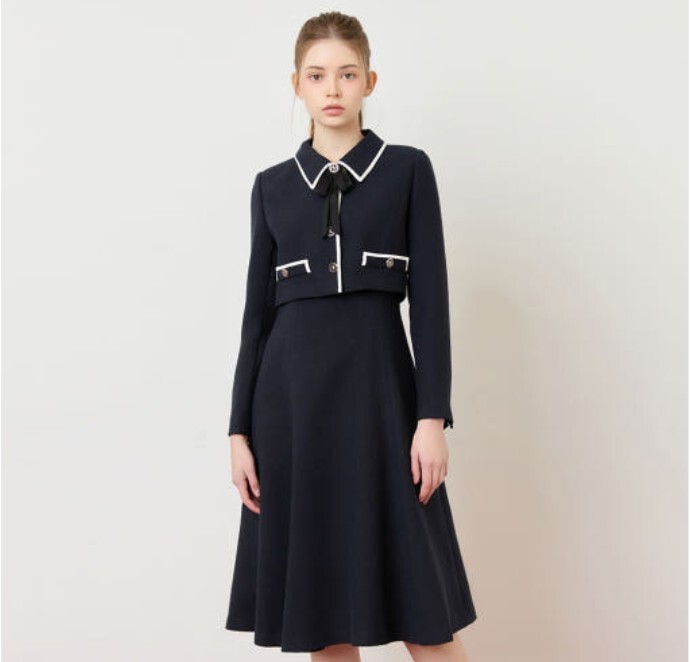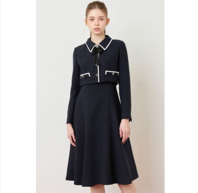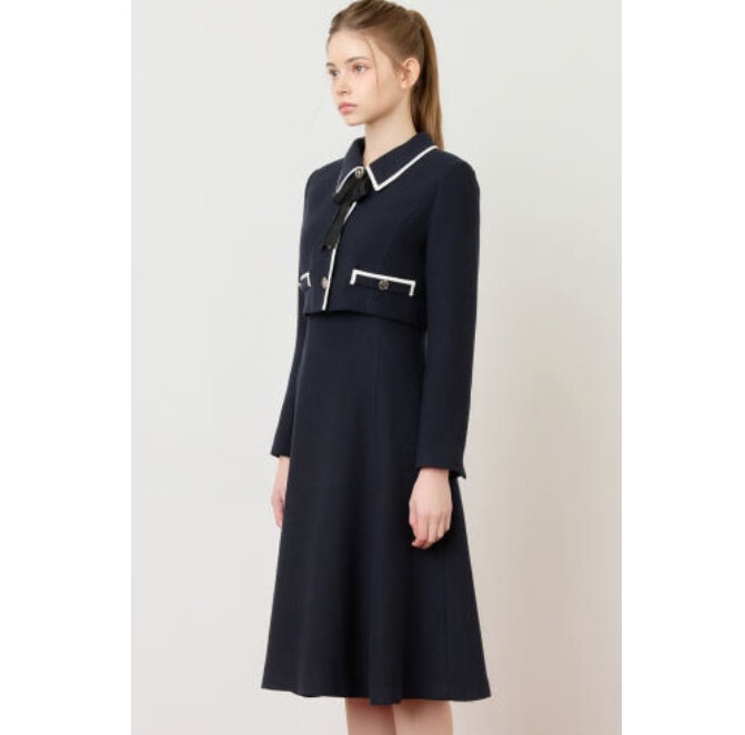 라인 배색과 리본 브로치 디테일이 매력적인 미디 기장 원피스입니다.