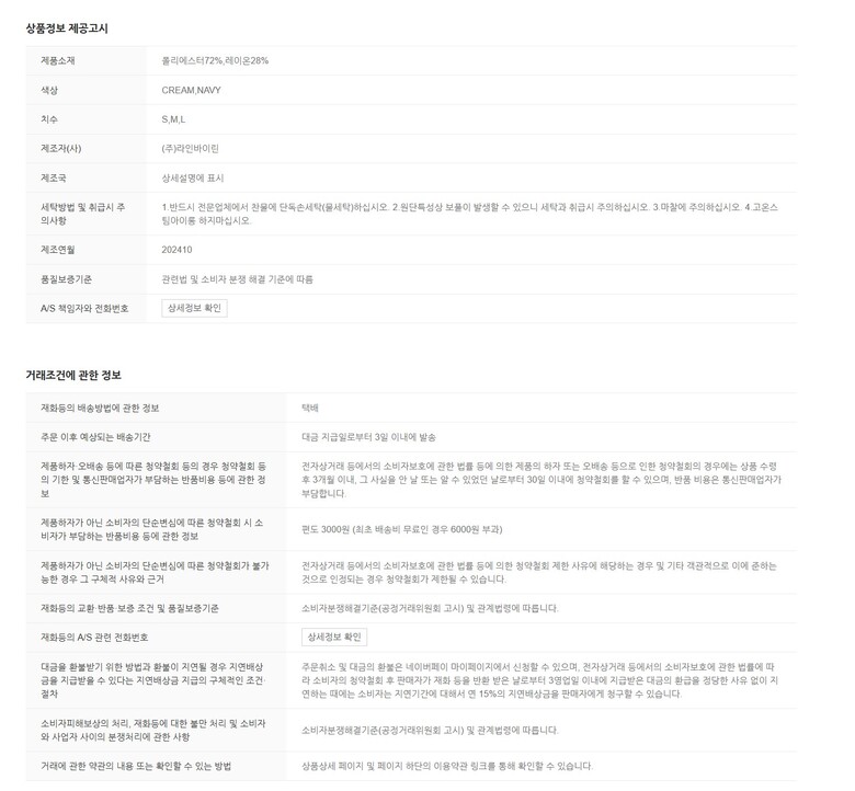1. 제품 소재 (섬유의 조성 또는 혼용률을 백분율로 표시, 기능성인 경우 성적서 또는 허가서) 상품상세참조