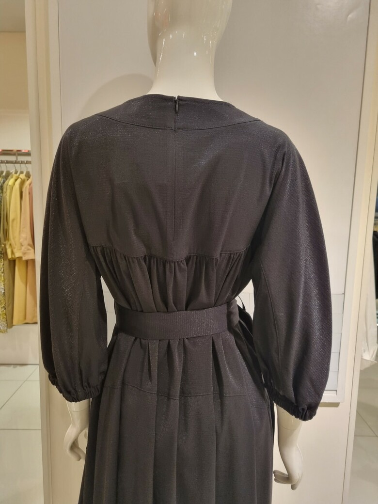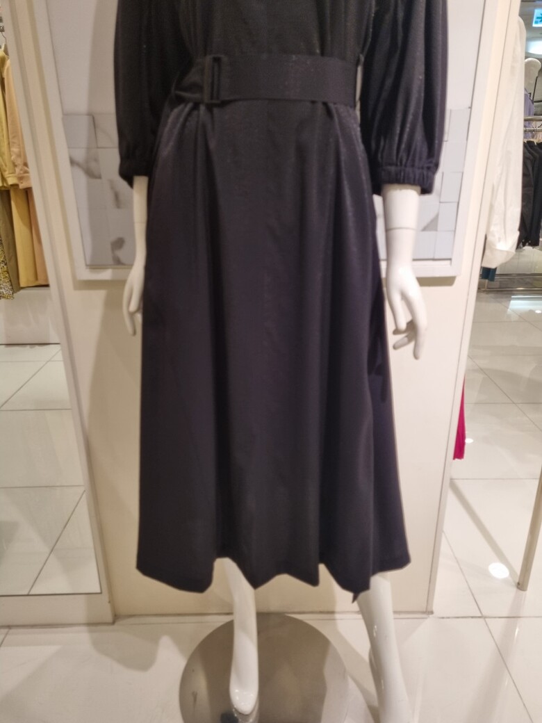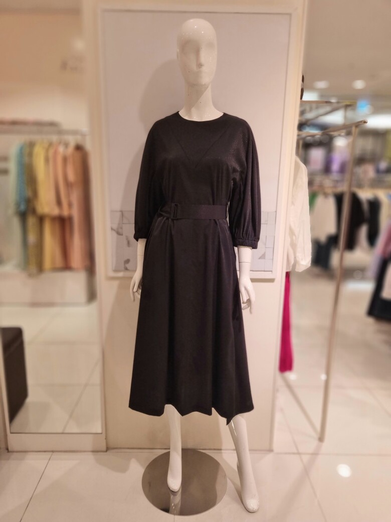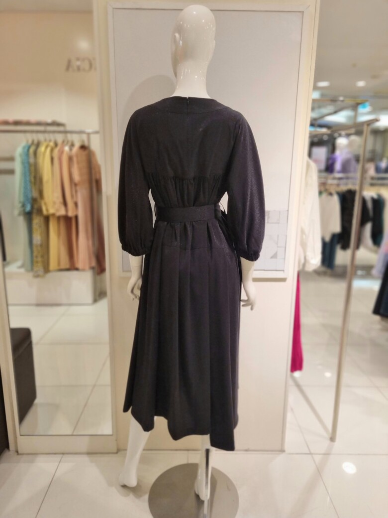 허리 벨트연출되는 뒤면 셔링이 포인트로 펄감이있는 롱기장 원피스입니다.