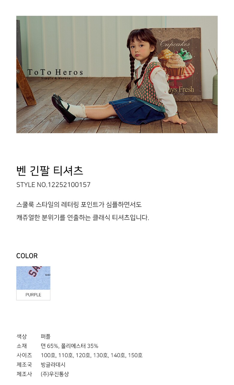 | 1. 제품 소재 (섬유의 조성 또는 혼용률을 백분율로 표시, 기능성인 경우 성적서 또는 허가서) | 면 65%, 폴리에스터 35% |