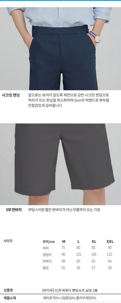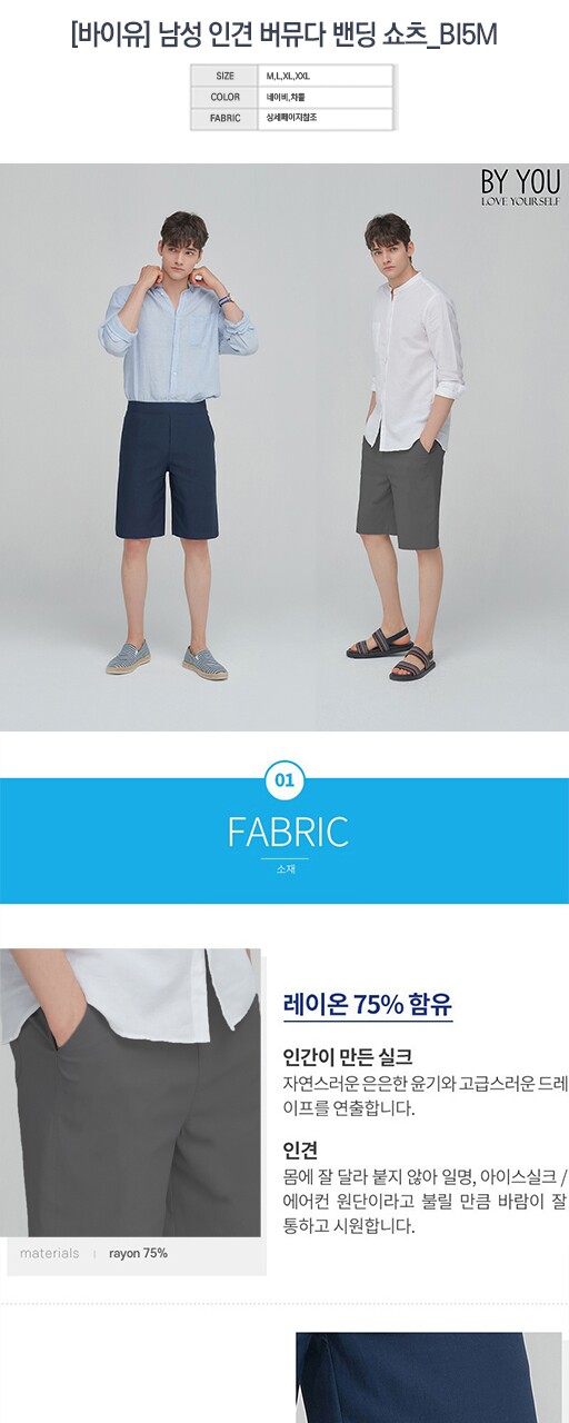 1. 제품 소재 (섬유의 조성 또는 혼용률을 백분율로 표시, 기능성인 경우 성적서 또는 허가서) [바이유] 남성 인견 버뮤다 밴딩 쇼츠 2종택1_BI5M