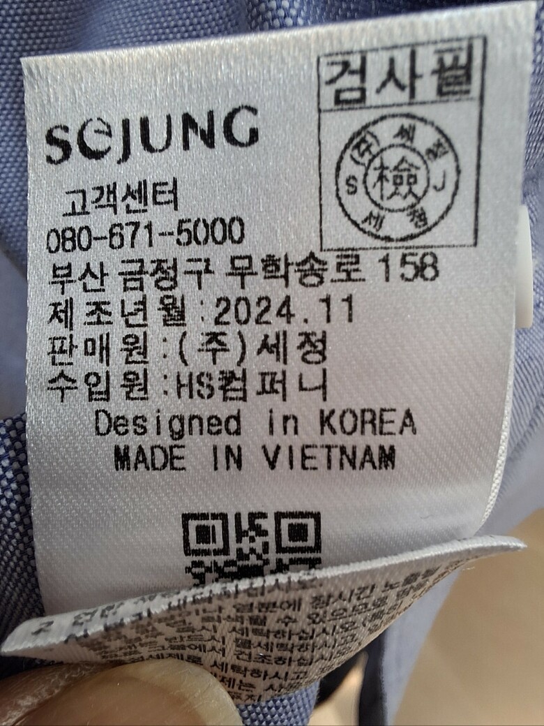 | 1. 제품 소재 (섬유의 조성 또는 혼용률을 백분율로 표시, 기능성인 경우 성적서 또는 허가서) | 면 100% |