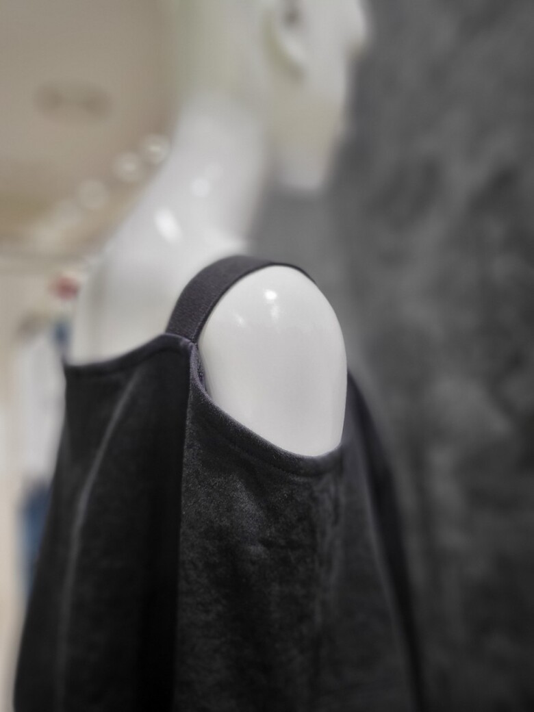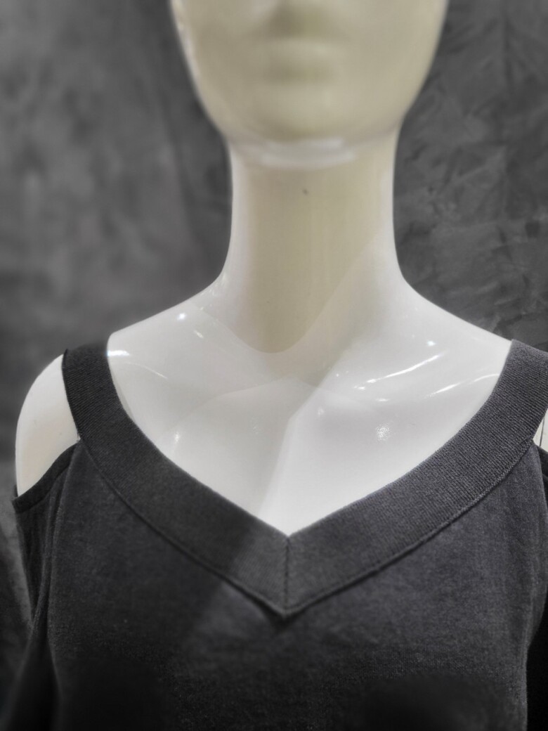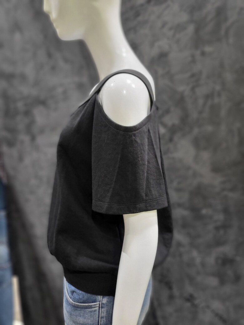 목선을 돋보이게 해주는 V넥과 오픈 숄더 형태로 여성스러운 라인을 살려줍니다.
