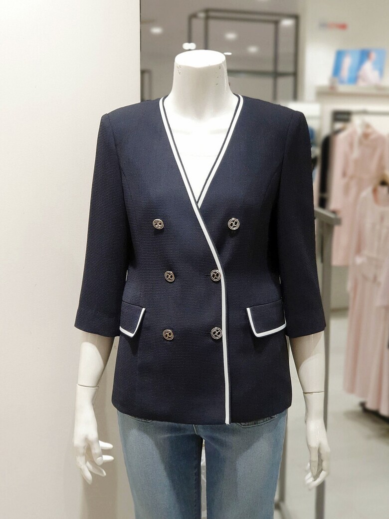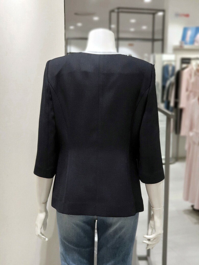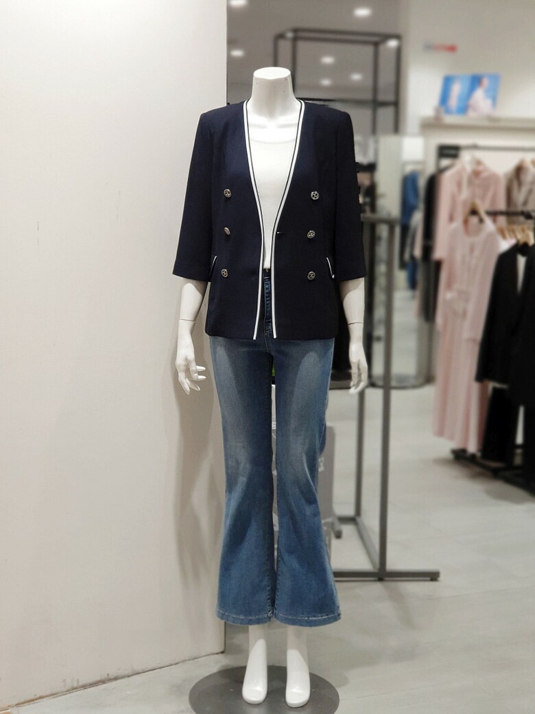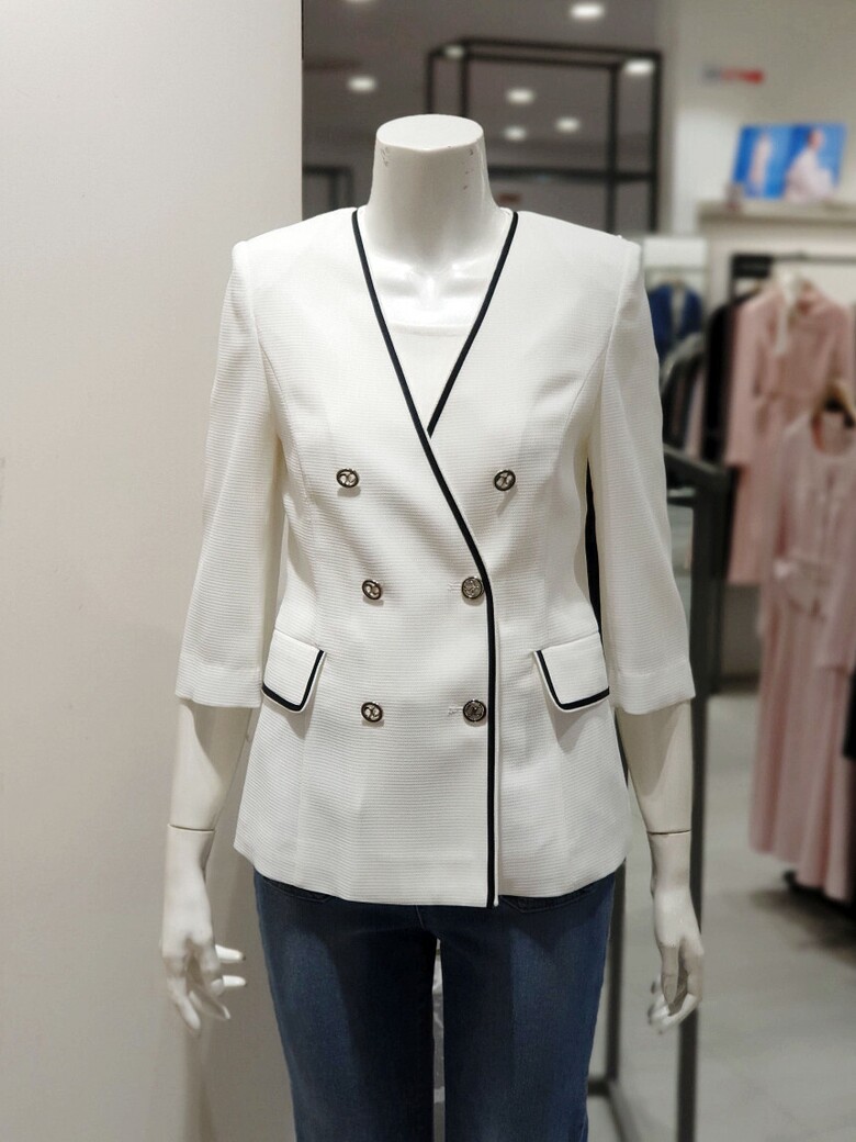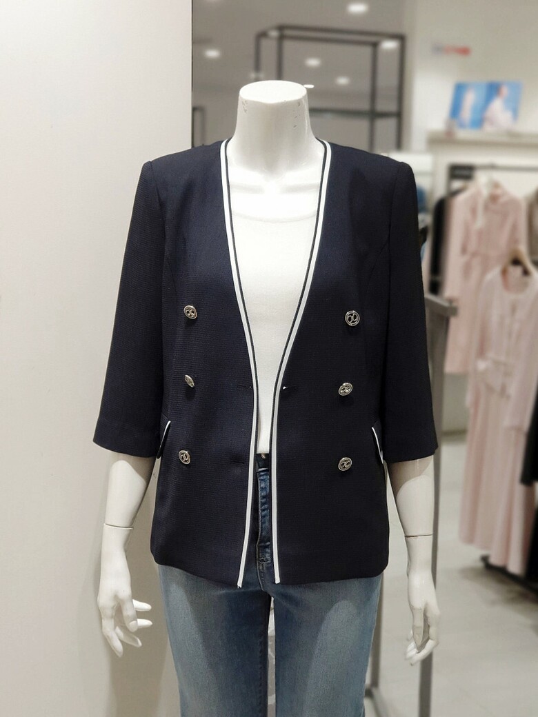 노 칼라 디자인으로 깔끔한 실루엣을 선사하는 재킷입니다.