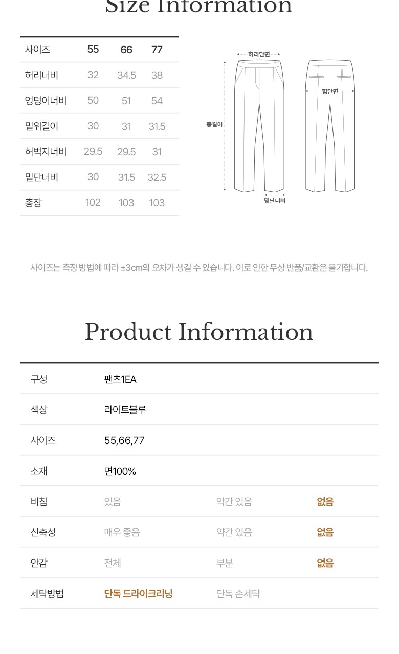 1. 제품 소재 (섬유의 조성 또는 혼용률을 백분율로 표시, 기능성인 경우 성적서 또는 허가서) | 면100% |