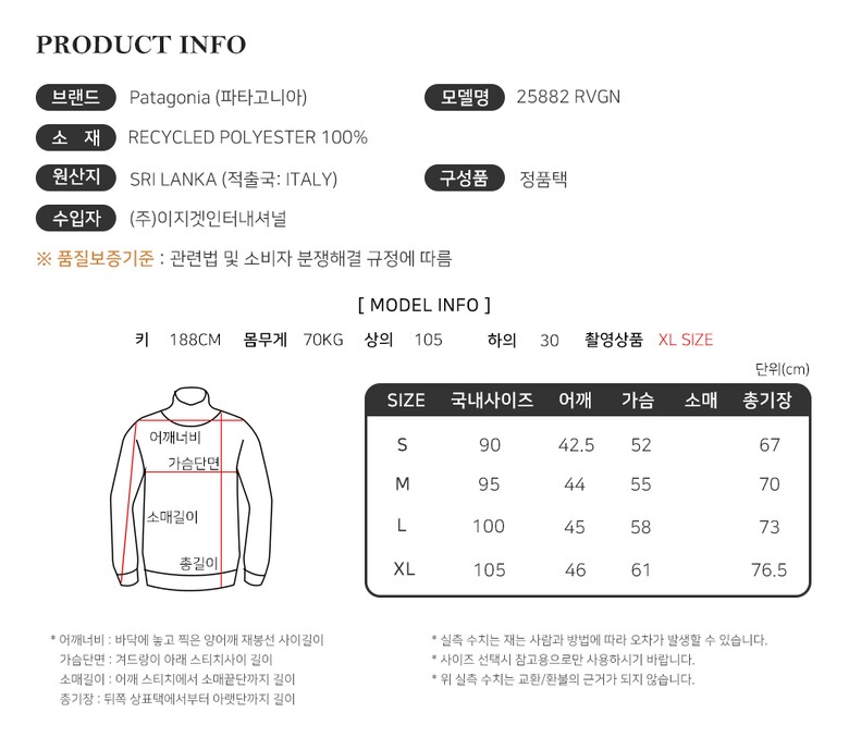 | 1. 제품 소재 (섬유의 조성 또는 혼용률을 백분율로 표시, 기능성인 경우 성적서 또는 허가서) | 상세페이지 참조 |