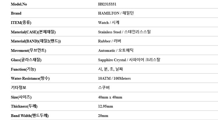 | 7. 주요 사양 | 스테인리스스틸 시계 오토매틱 |