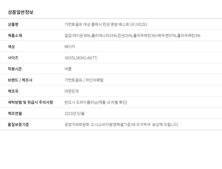 | 1. 제품 소재 (섬유의 조성 또는 혼용률을 백분율로 표시, 기능성인 경우 성적서 또는 허가서) | 겉감:레이온38%,폴리에스터33%,린넨26%,폴리우레탄3% 배색:면97%,폴리우레탄3% |