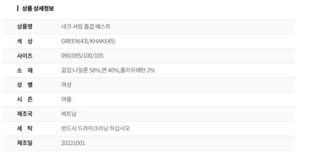 | 1. 제품 소재 (섬유의 조성 또는 혼용률을 백분율로 표시, 기능성인 경우 성적서 또는 허가서) | 상품상세참조 |