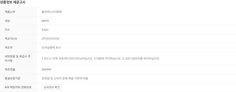 | 6. 세탁방법 및 취급시 주의사항 | 상품상세참조 |