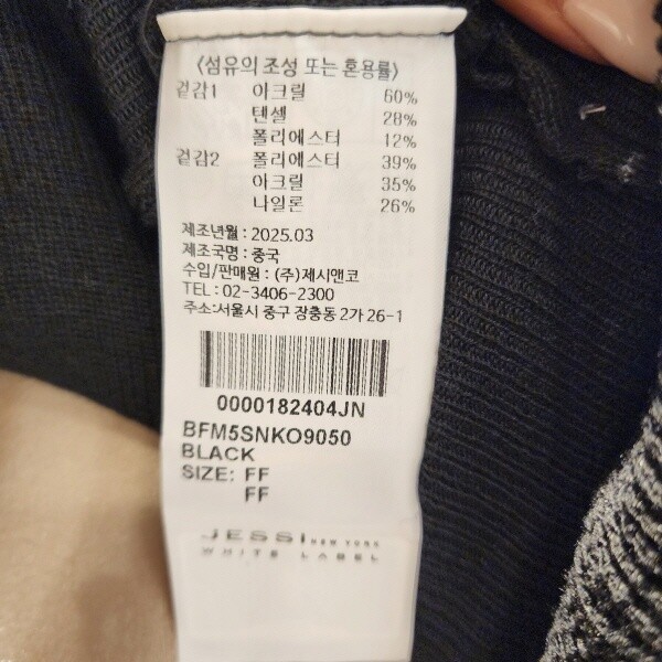제품소재 : 아크릴60%,텐셀28%,폴리에스터12%,겉감 폴리에스터39%,아크릴35%,나일론26%