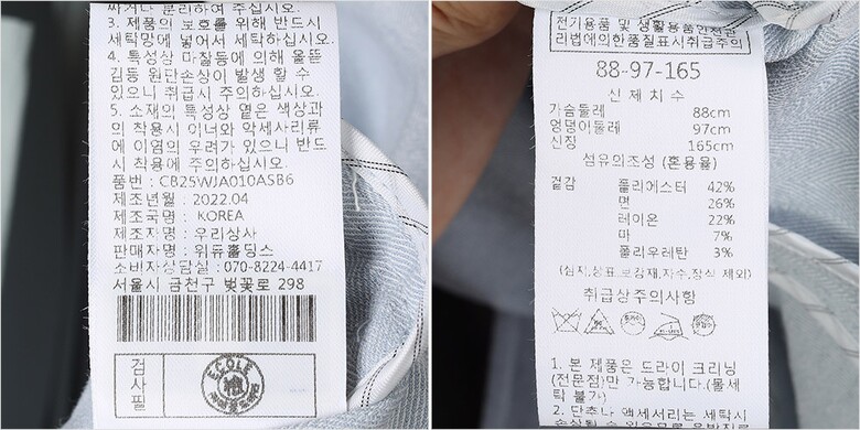 | 1. 제품 소재 (섬유의 조성 또는 혼용률을 백분율로 표시, 기능성인 경우 성적서 또는 허가서) | 겉감-면26% 폴리에스터42% 폴리우레탄3% 레이온22% 마7% |