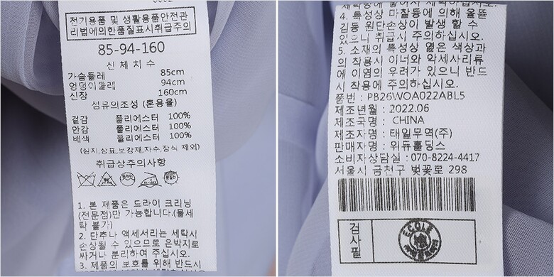 | 1. 제품 소재 (섬유의 조성 또는 혼용률을 백분율로 표시, 기능성인 경우 성적서 또는 허가서) | 겉감-폴리에스터100% 안감-폴리에스터100% 배색-폴리에스터100% |