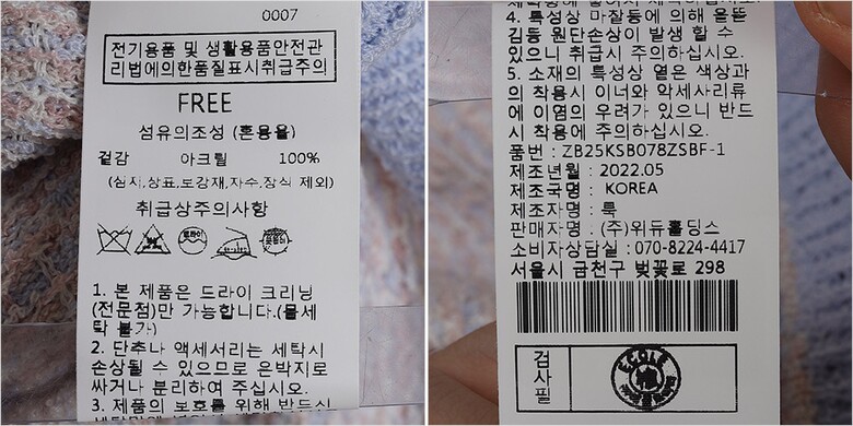 1. 제품 소재 (섬유의 조성 또는 혼용률을 백분율로 표시, 기능성인 경우 성적서 또는 허가서) | 겉감-아크릴100% |