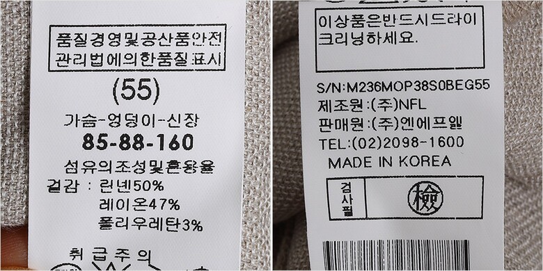| 1. 제품 소재 (섬유의 조성 또는 혼용률을 백분율로 표시, 기능성인 경우 성적서 또는 허가서) | 겉감-폴리우레탄3% 레이온47% 린넨50% |