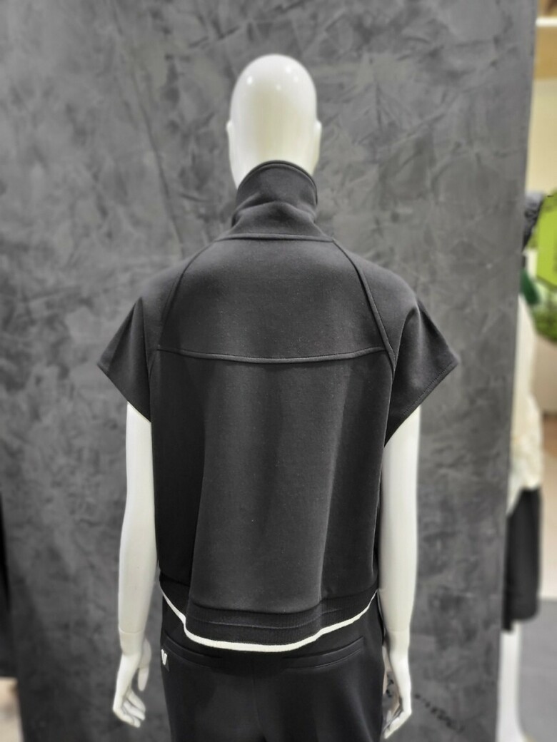 넥 부분의 자수와 밑단의 니트 시보리로 포인트를 더했으며,