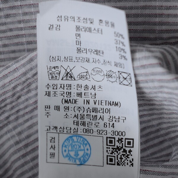 제품소재 : 폴리에스터50%, 면37%, 마10%, 폴리우레탄3%